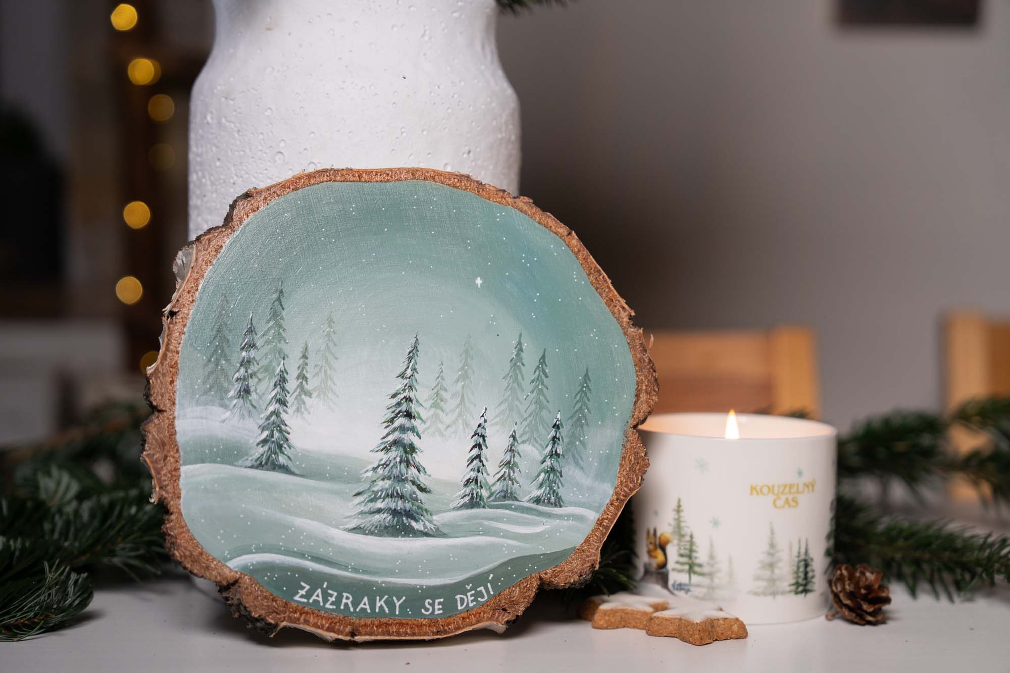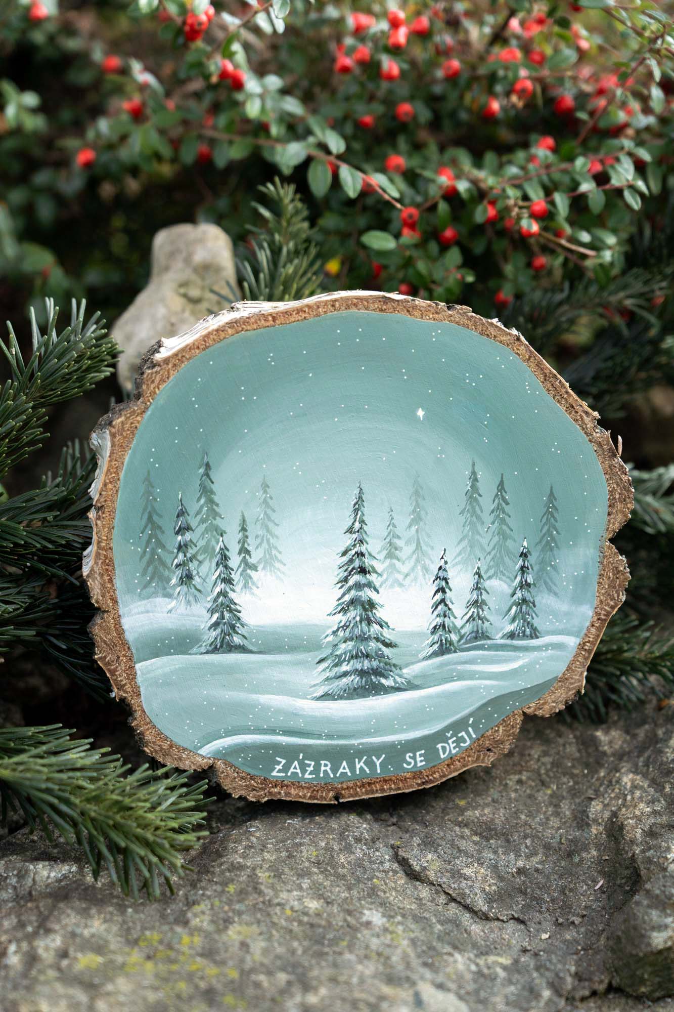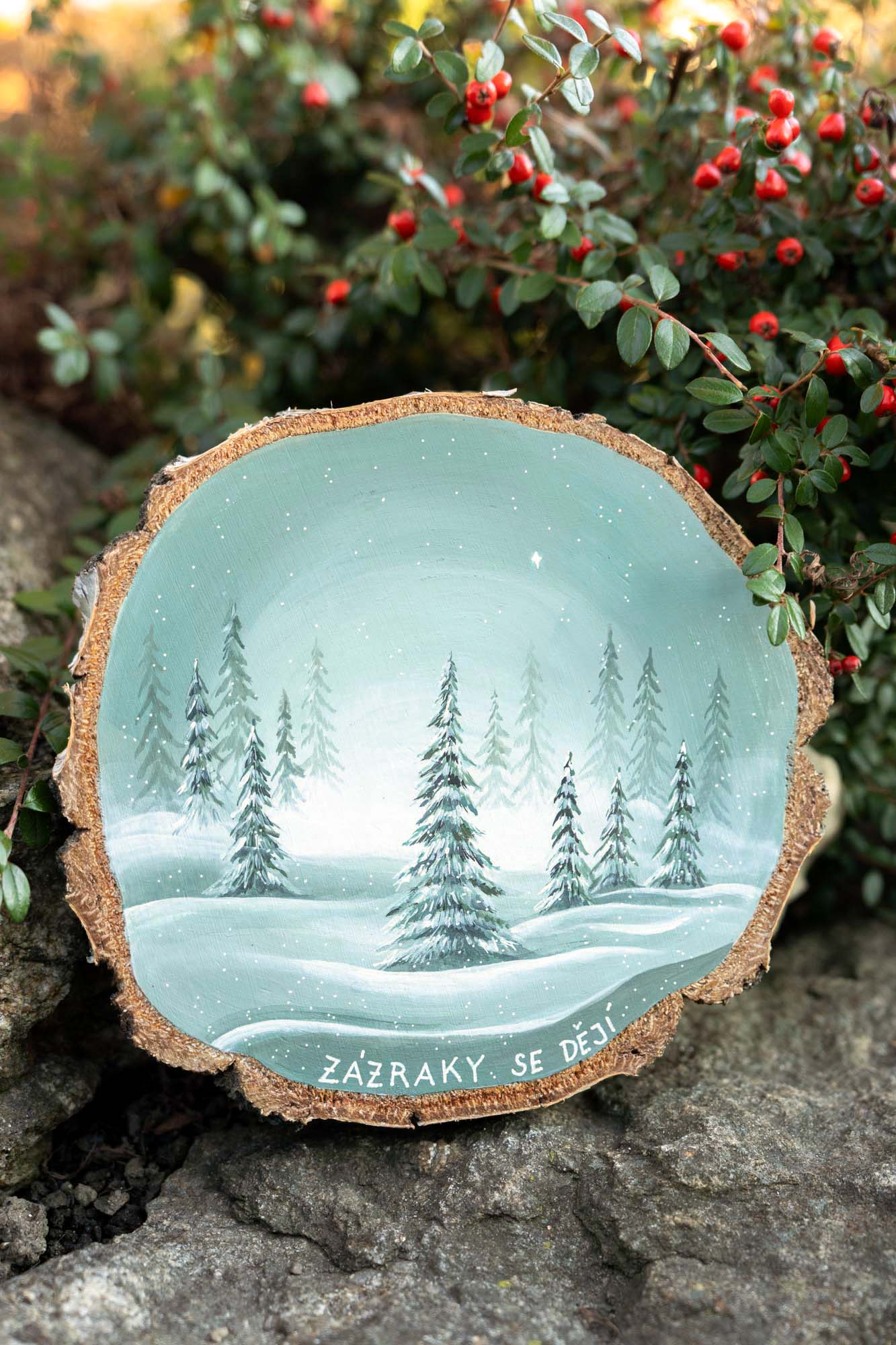 Dřevěný malovaný obrázek – zimní kouzlo lesa přinese do vašeho domova kousek přírody i vůni lesa.