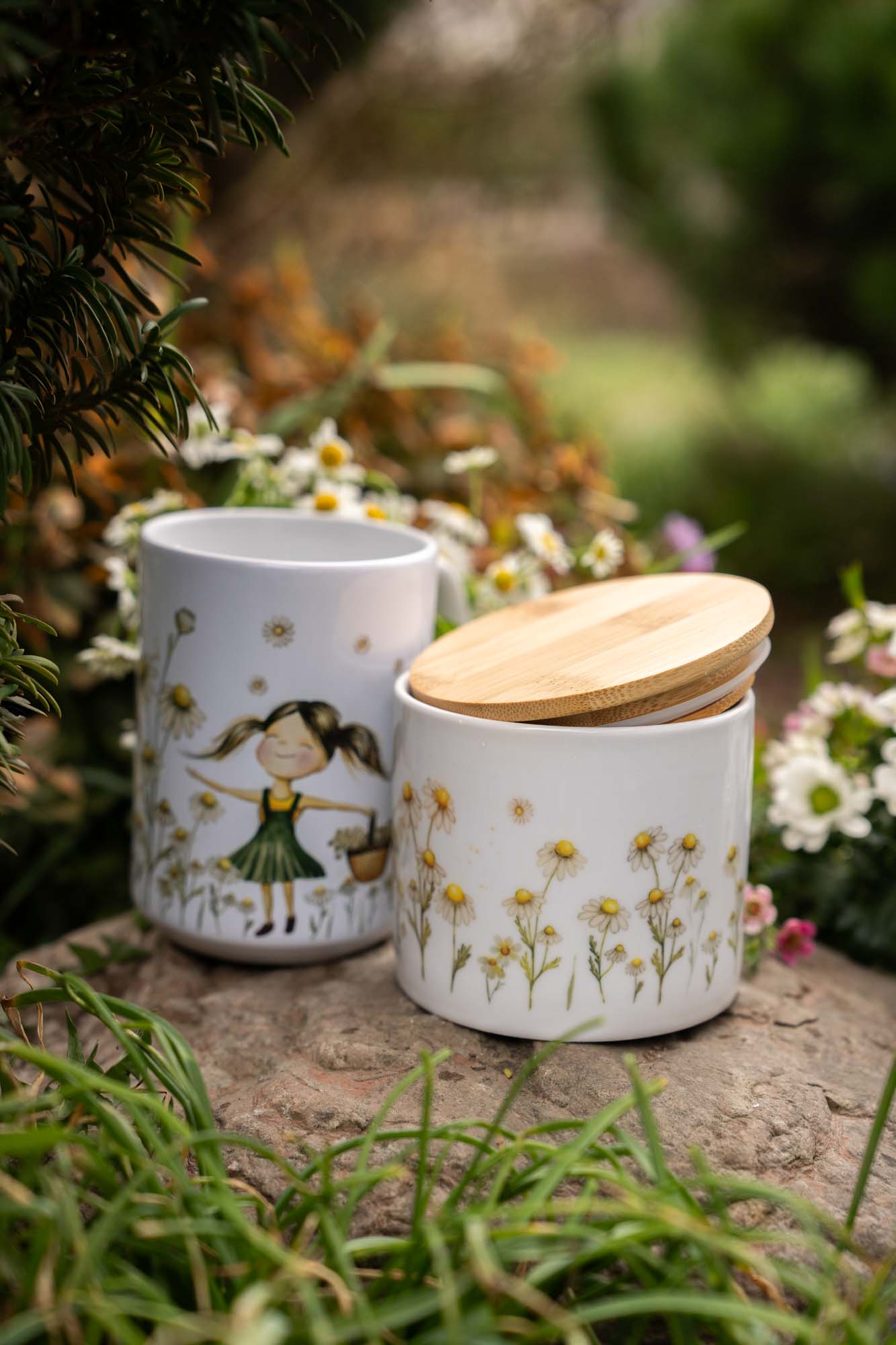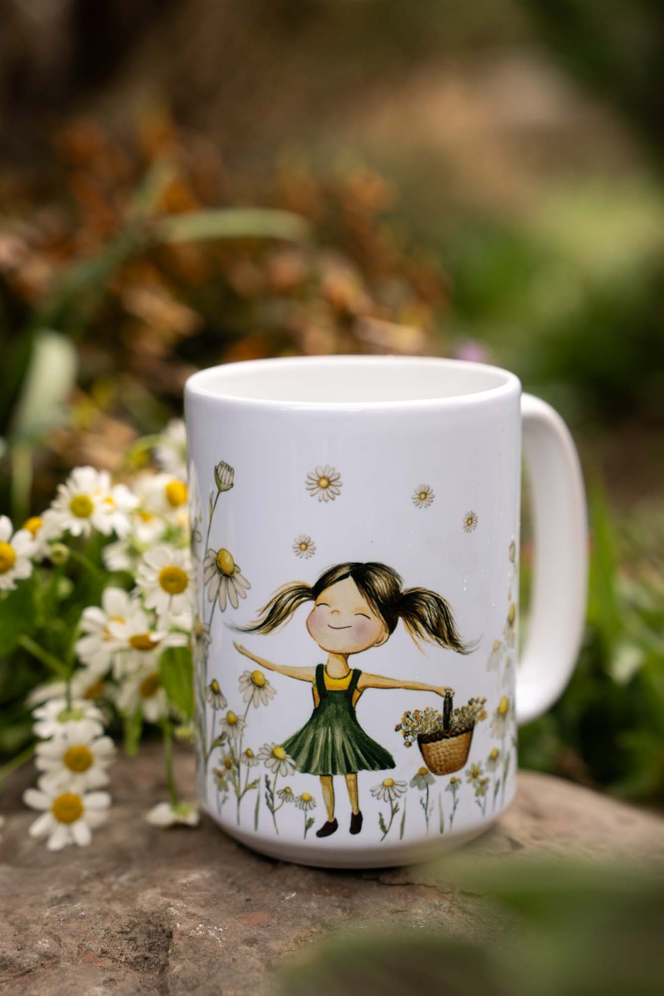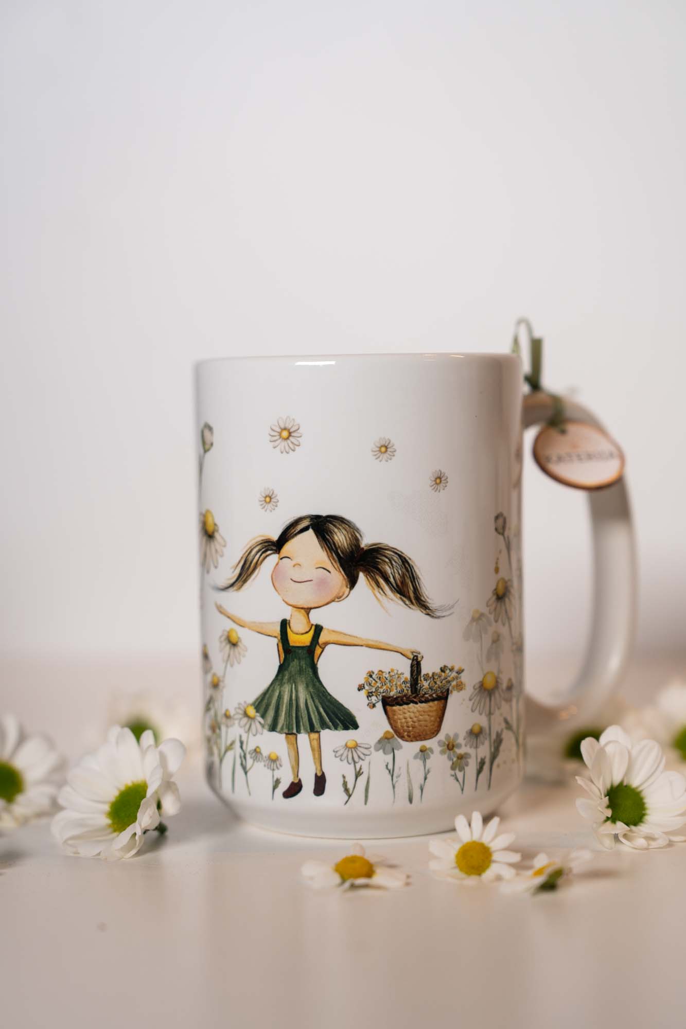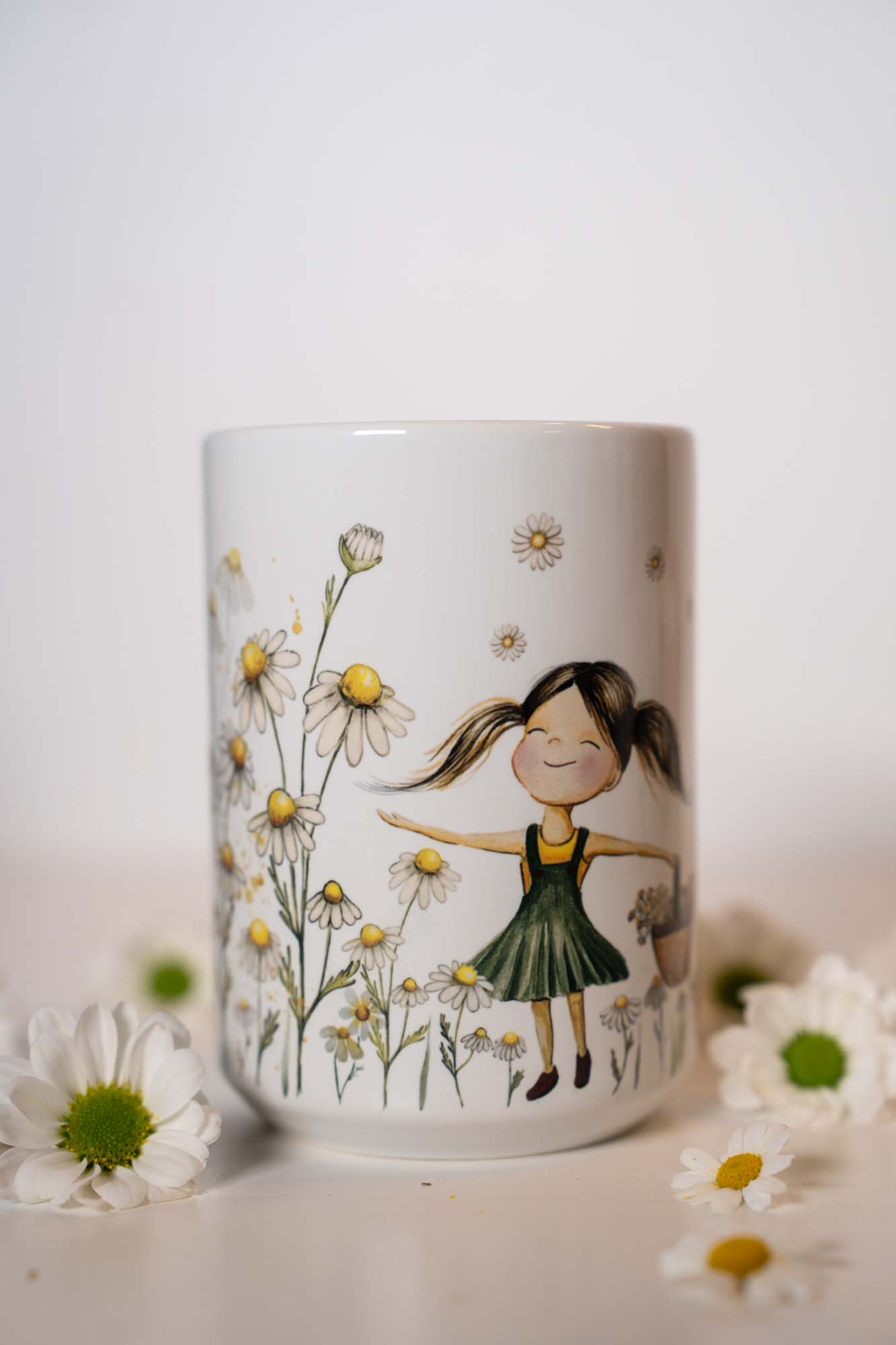 Skladem – výroba obratemKafák/čaják o objemu 450 ml s něžnou akvarelovou malbou holčičky mezi květy heřmánků přináší klid a jemnou pohádkovou atmosféru do každodenních chvil.