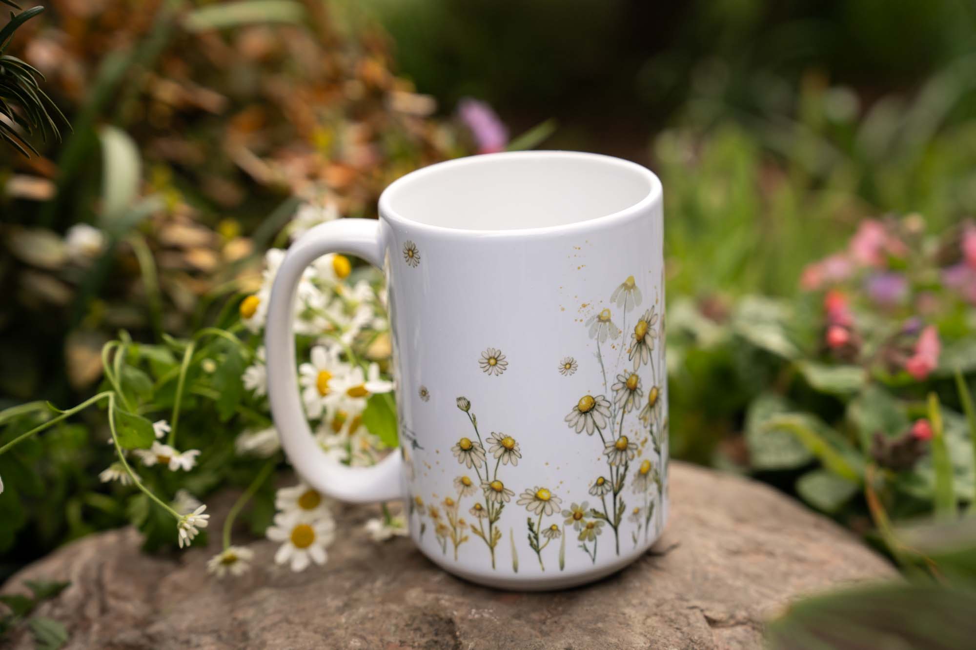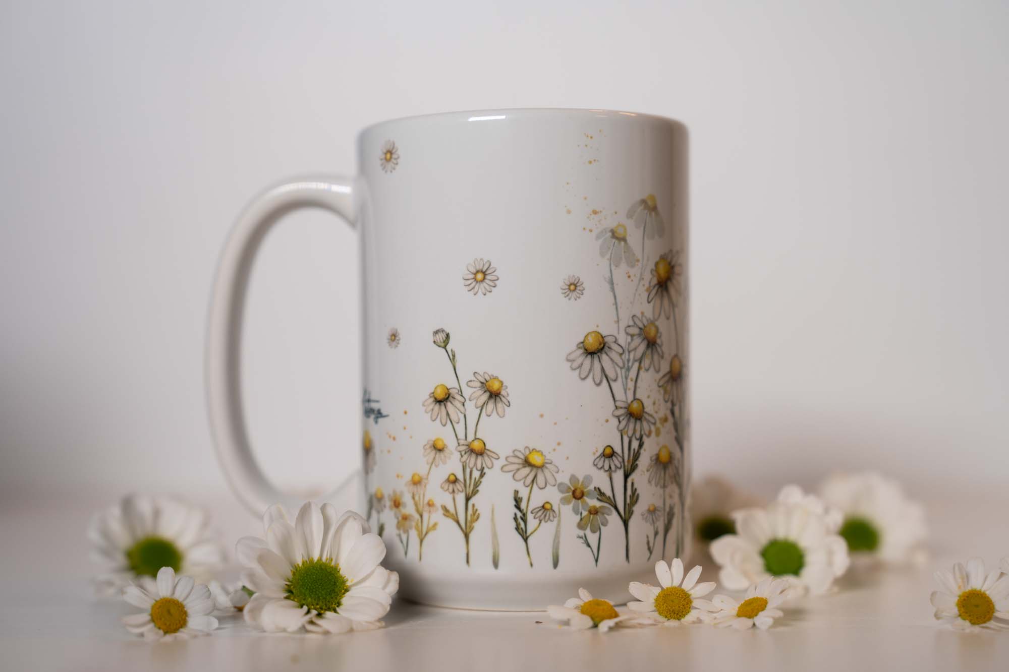 Heřmánky zdobí hrnek po celém obvodu. Čistě bílý podklad nechává vyniknout každému detailu malby a podtrhuje její jemnou estetiku.