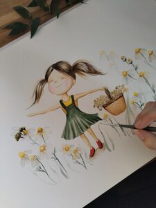 Hlavním motivem je něžná, lehce pohádková scéna – malá holčička s plným košíkem heřmánků, která běží rozkvetlou loukou zalitou sluncem. Její pohyb působí lehce a svobodně, jako by tančila ve větru. Okolo ní se vlní bílé květy heřmánku a vytvářejí měkký, klidný svět plný světla, radosti a nevinnosti. Celý motiv působí jako zachycený okamžik z pohádky.