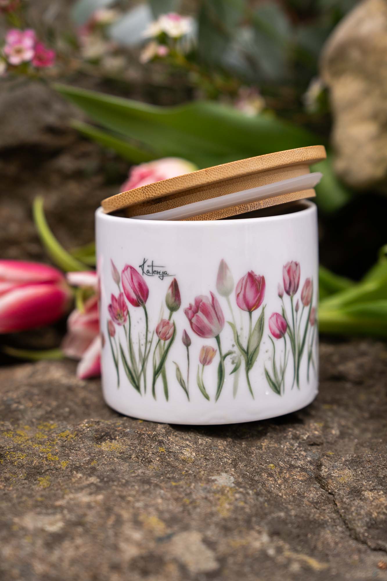 - Keramickou dózu s bambusovým víčkem s tiskem autorské malby – Tajemství tulipánů