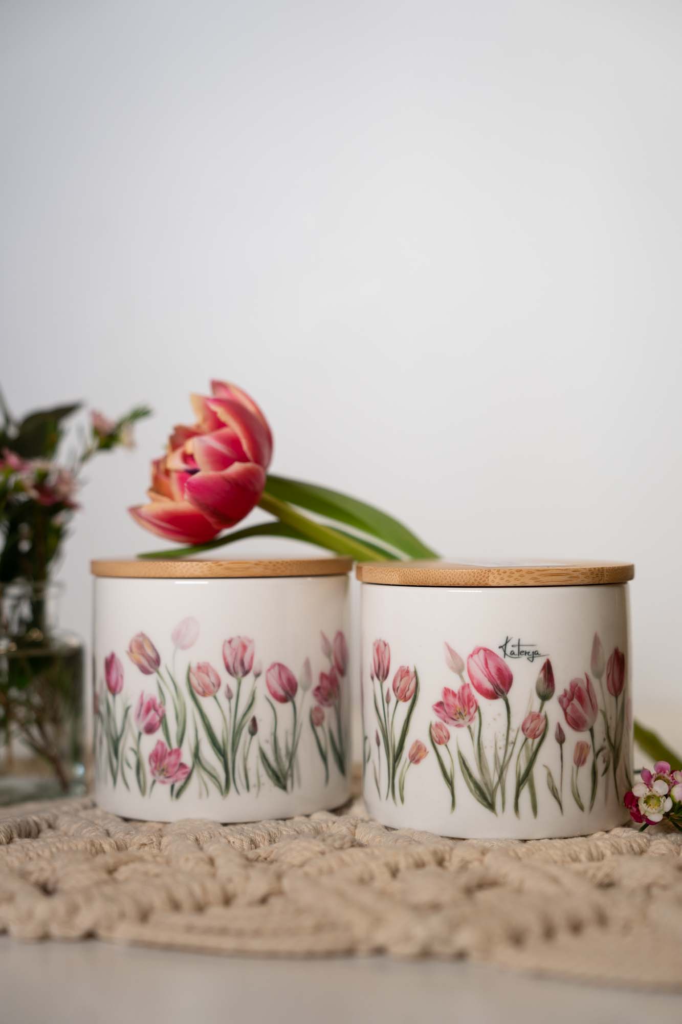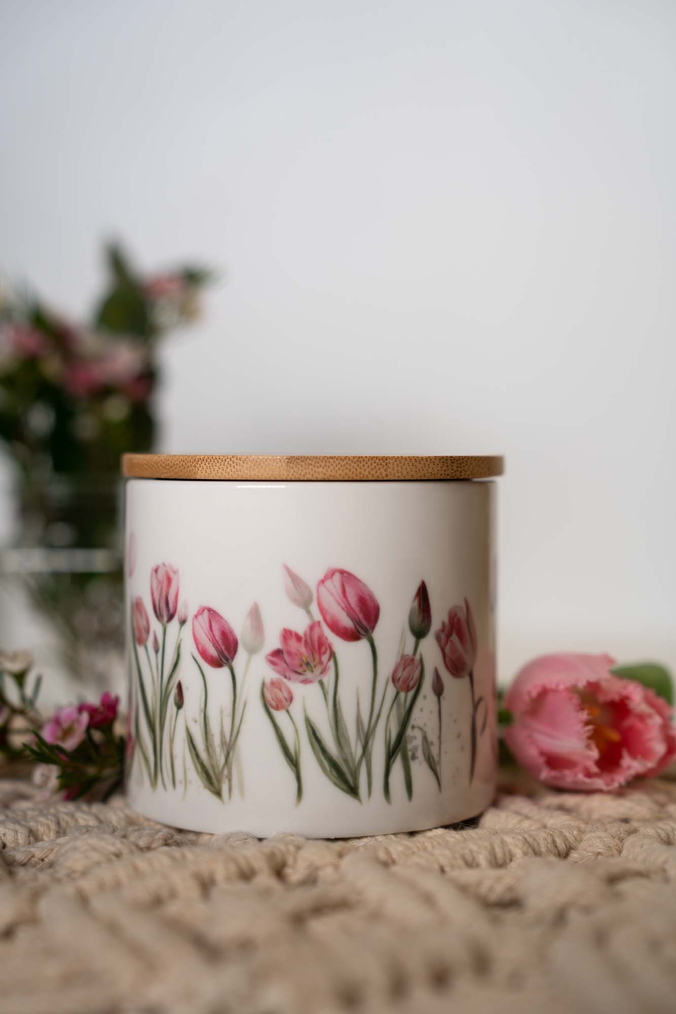 Keramická dóza s jemným akvarelovým motivem růžových tulipánů v sobě spojuje estetiku přírody s praktickým využitím v každodenním životě.