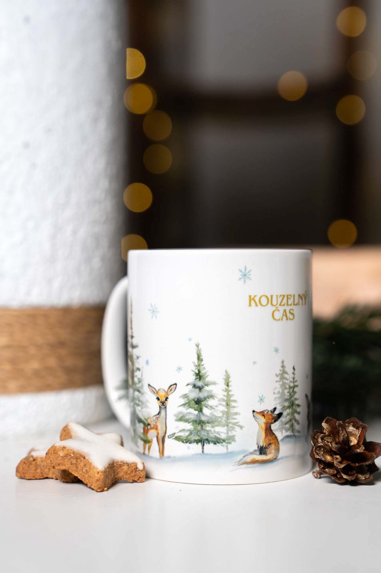 Keramický hrnek 330ml lesklý s krásným zimním motivem kolem celého hrnečku a nápisem Kouzelný čas uprostřed malby.