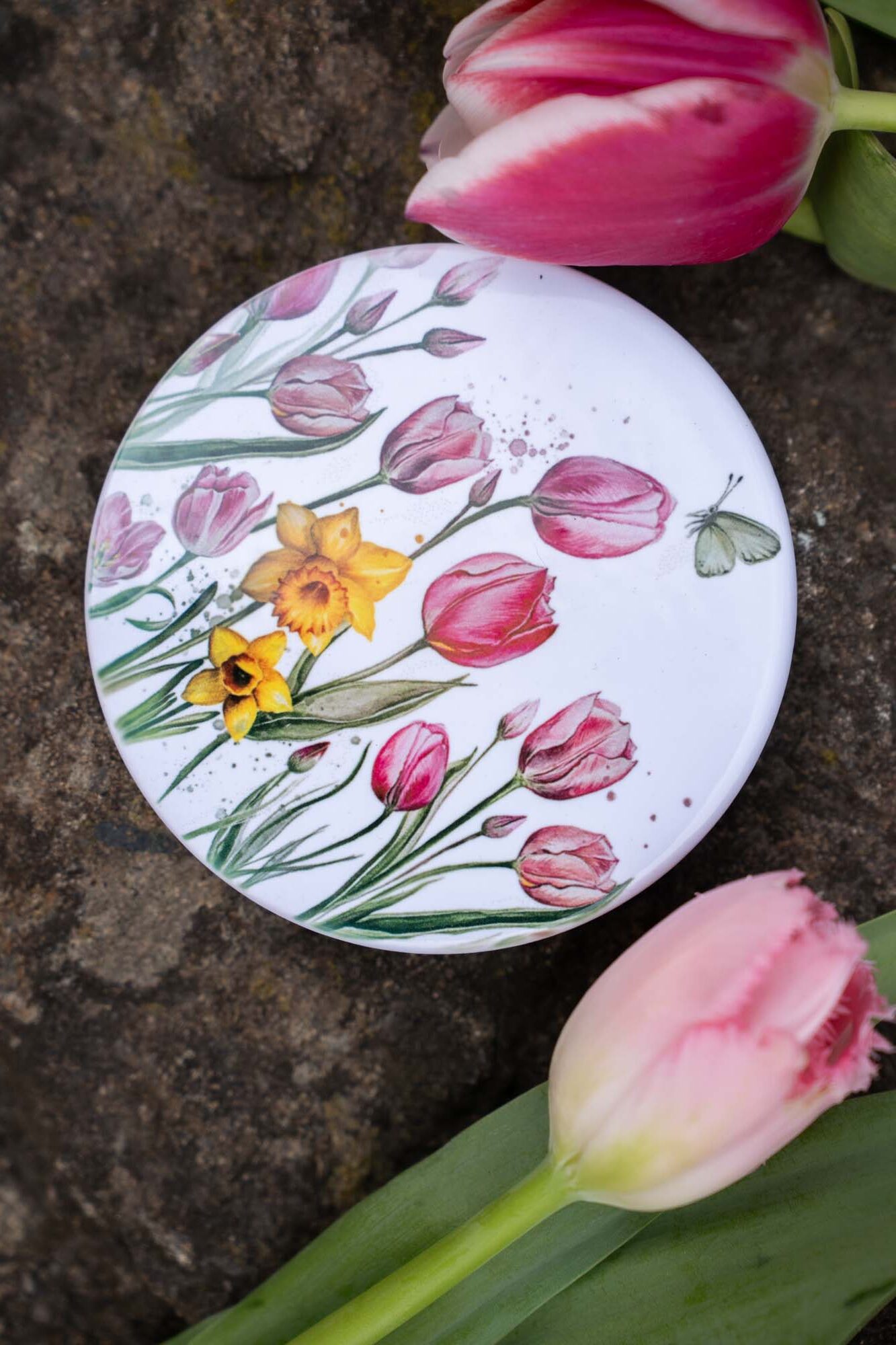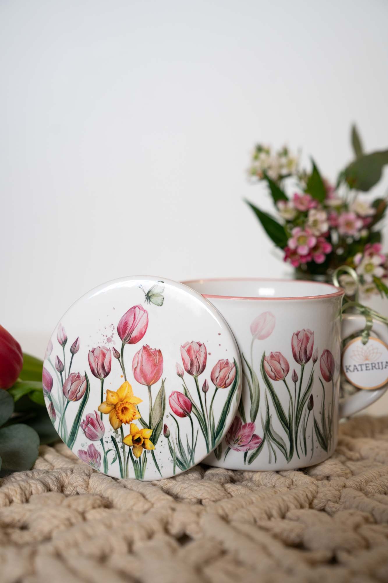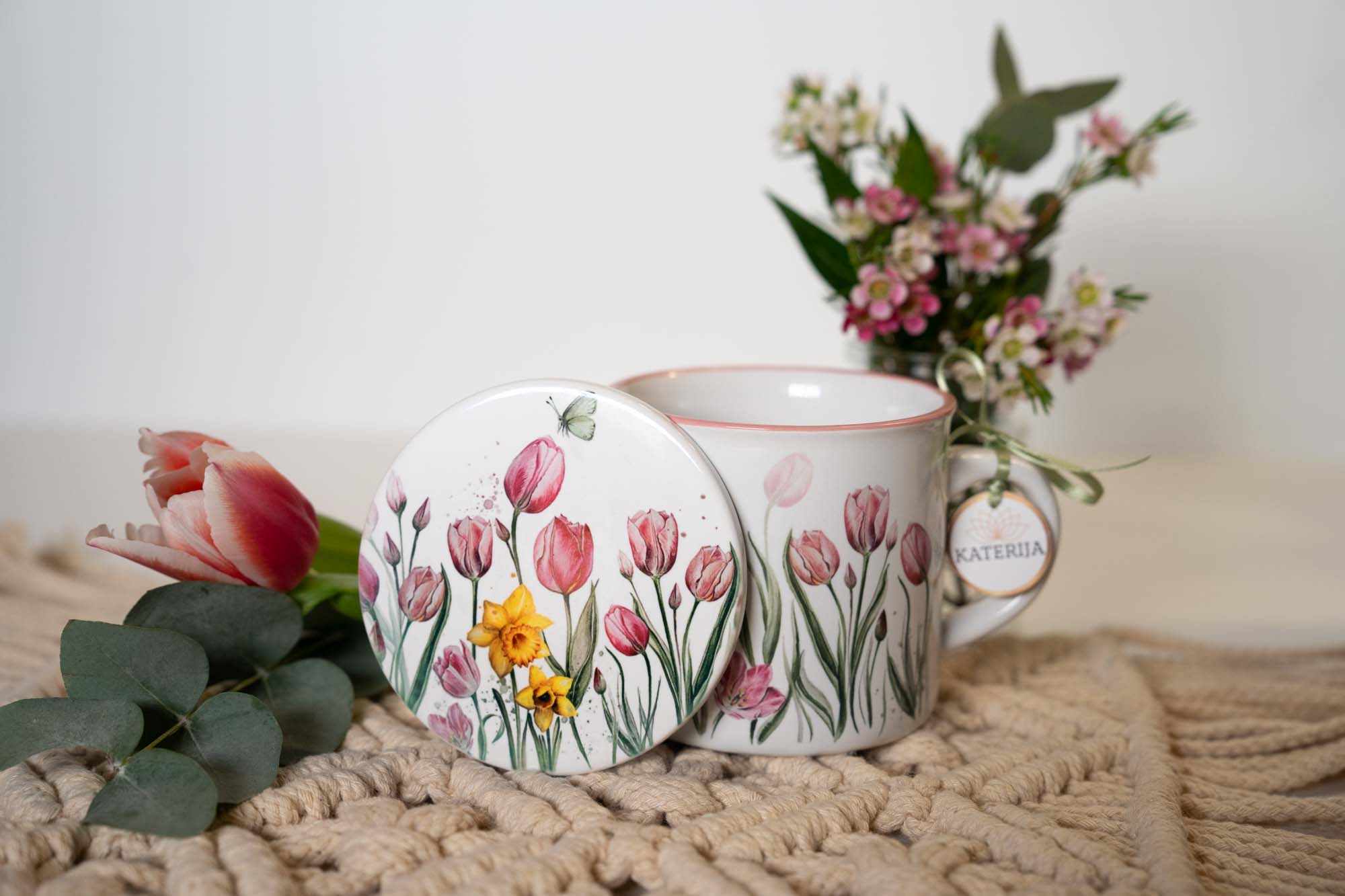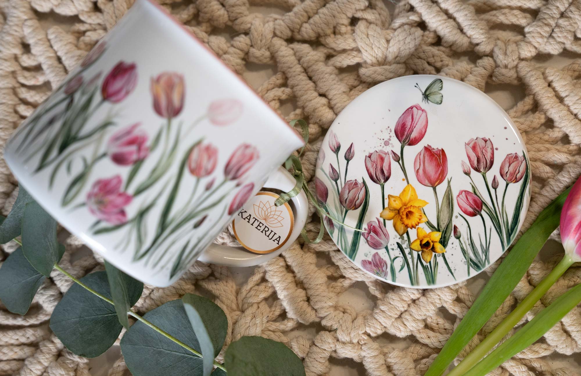 Keramický podtácek s jemným akvarelovým motivem růžových tulipánů a zářivých žlutých narcisek spojuje estetiku přírody s praktickým využitím v každodenním životě. Motiv květin je pečlivě vytvořen tak, aby evokoval pocit klidu, harmonie a jemné elegance, zatímco každý detail akvarelu dodává celku přirozenou lehkost a vzdušnost. Růžové tulipány symbolizují něhu, laskavost a harmonii, zatímco žluté narcisky přinášejí do motivu optimismus, radost a nové začátky. Díky této kombinaci se podtácek stává nejen praktickým doplňkem, ale i inspirativním kouskem, který dokáže zpříjemnit každodenní chvíle s oblíbeným nápojem.