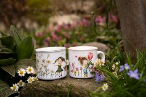 Skladem – výroba obratemKeramický retro hrnek s něžnou akvarelovou malbou holčičky v heřmáncích přináší do každodenních chvil klid, jemnost a dotek letní pohádky.
