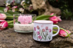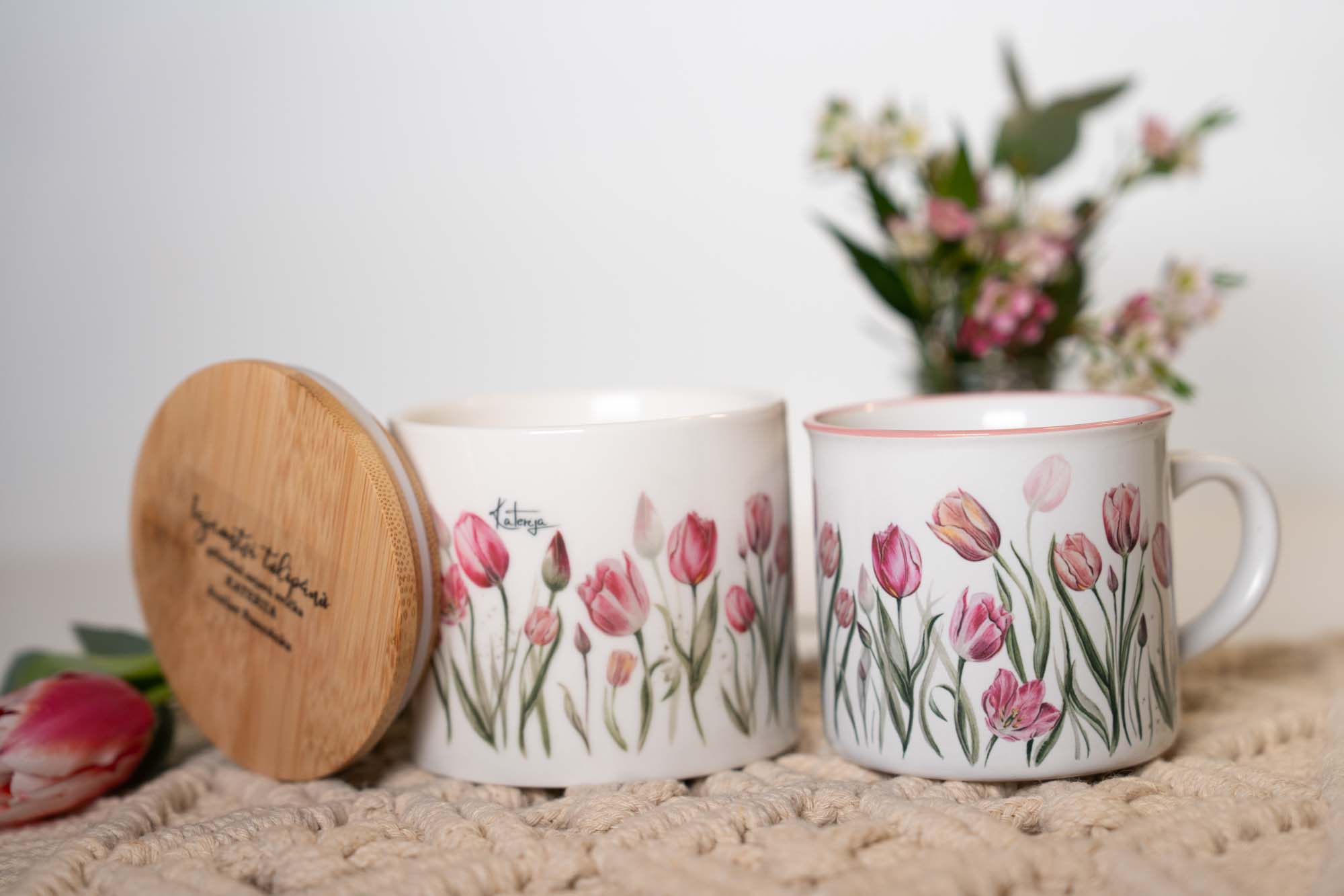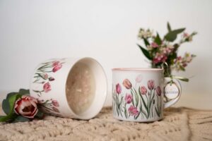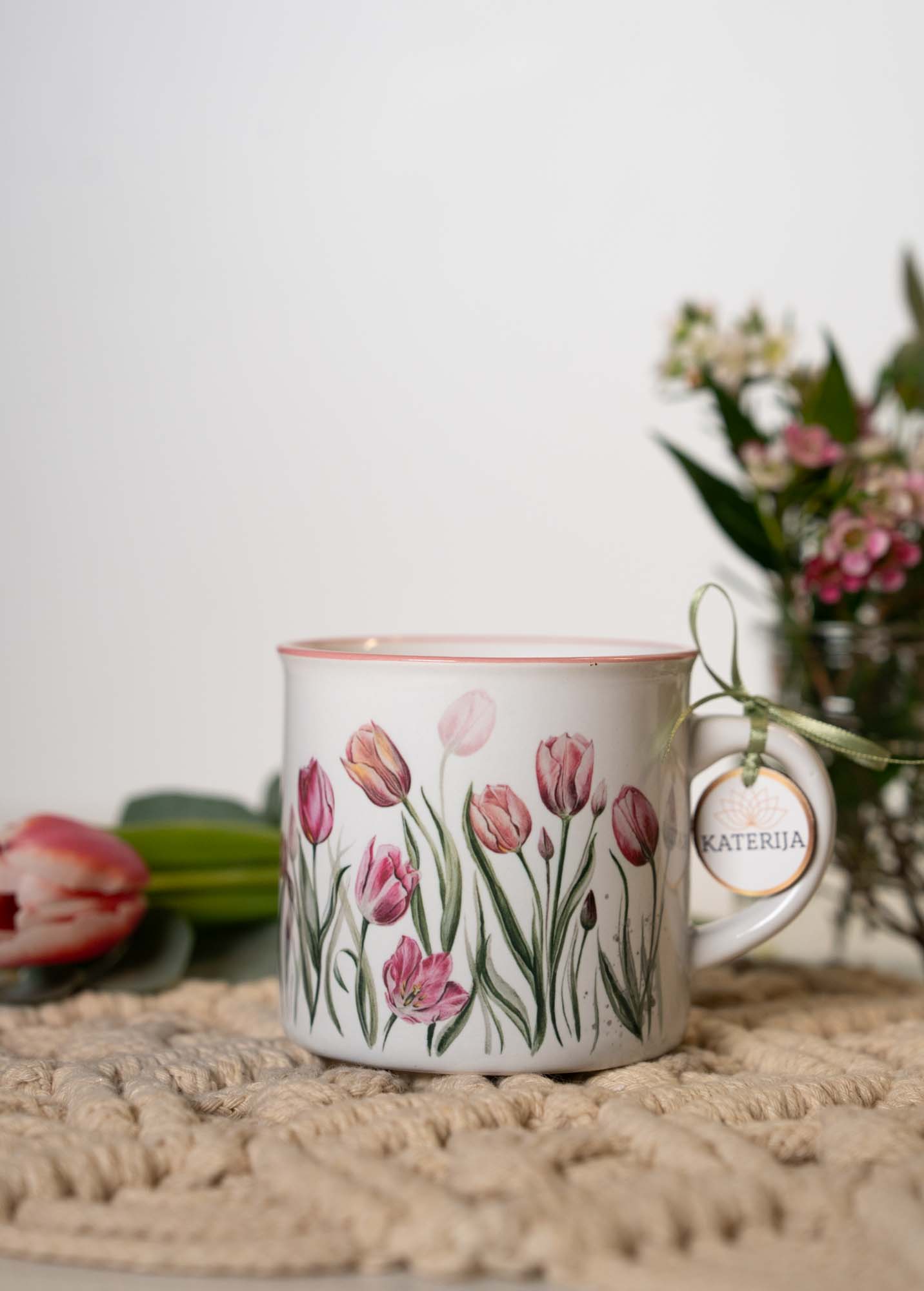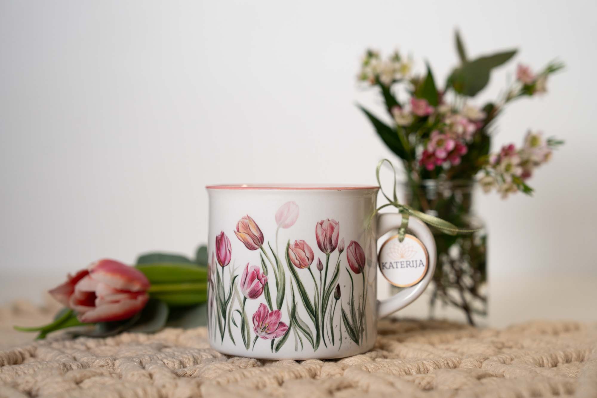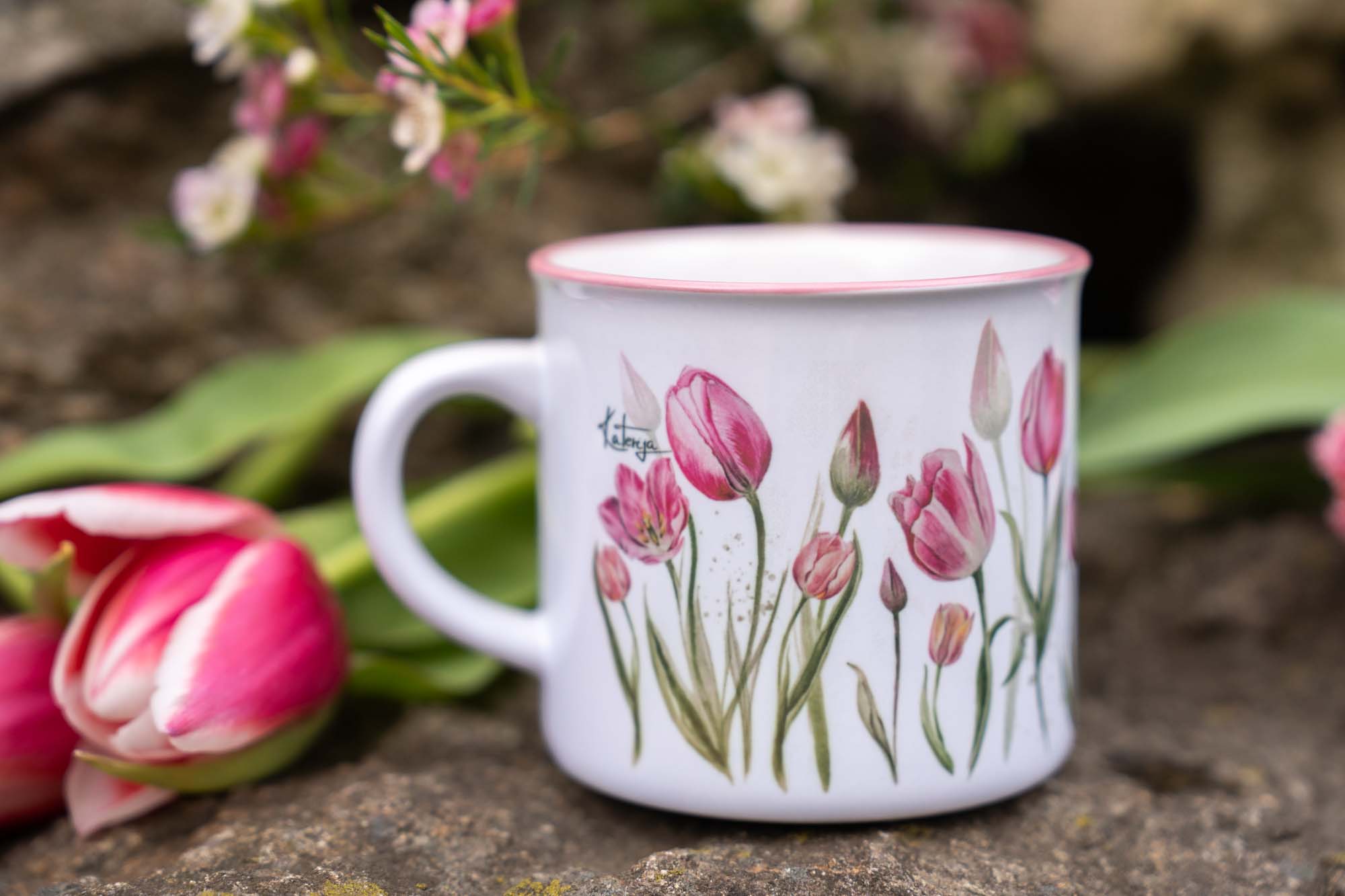 - Hrnek v retro stylu o objemu 300ml s tiskem autorské malby – Tajemství tulipánů