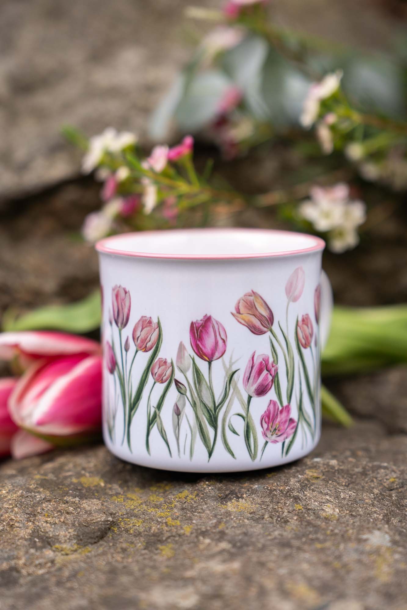 Keramický hrnek v retro stylu s růžovým lemem o objemu 300 ml pro každodenní používání. Hrneček s touto autorskou malbou si oblíbí každý milovník tulipánů, květin a rozkvetlých jarních zahrádek. Společníka vám bude dělat na terase při ranní kávě, nebo na chaloupce díky svému jedinečnému designu. Jeho tvar vychází z klasických siluet, které připomínají poctivou řemeslnou výrobu minulých let – jemně zaoblené linie, pohodlné ouško a stabilní základ vytvářejí harmonický celek, který skvěle padne do ruky.