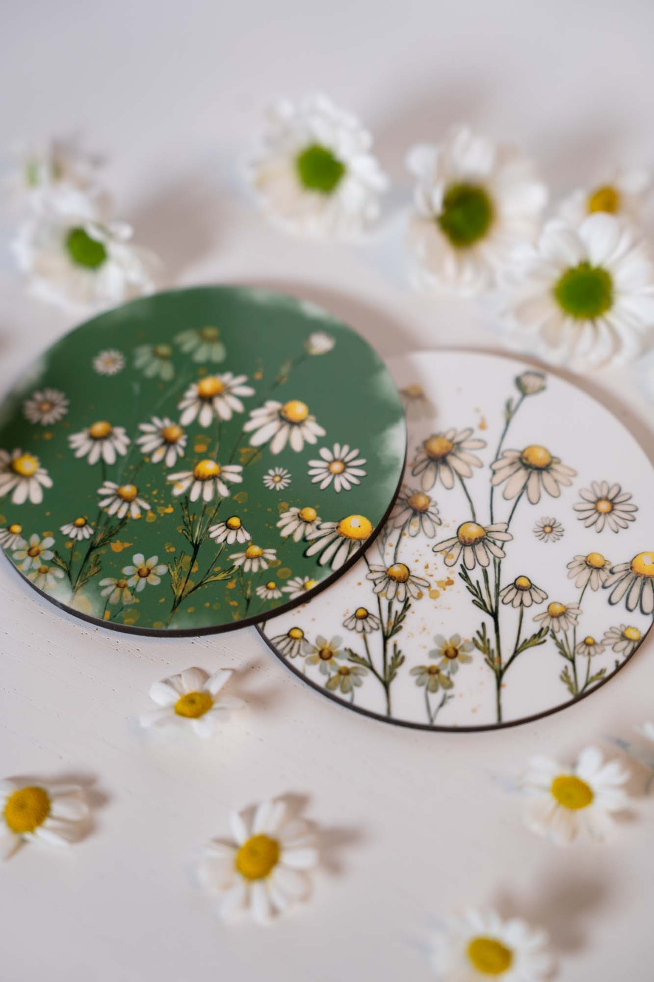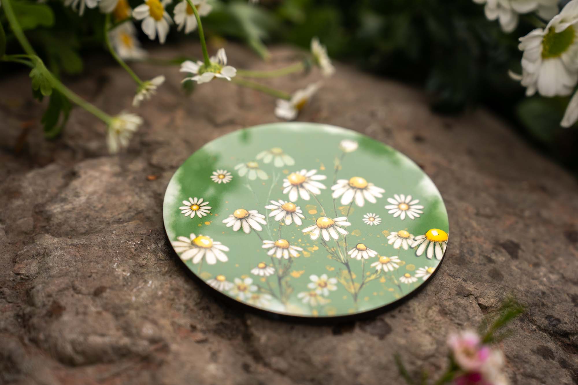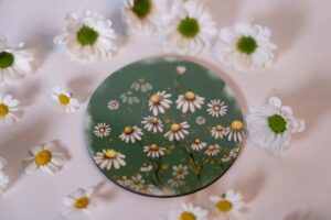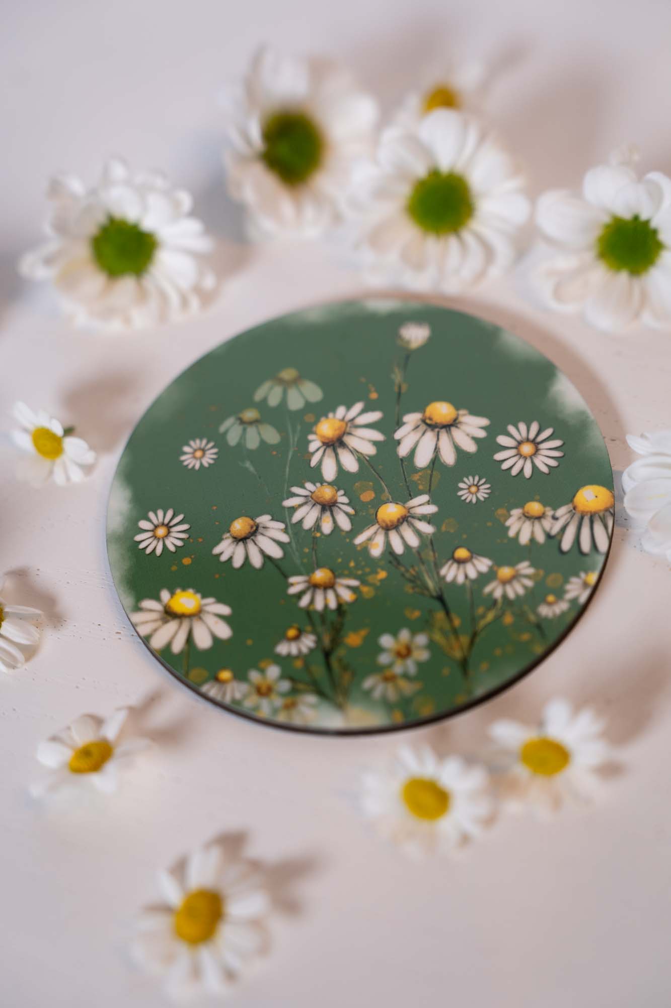 Kulatý podtácek s jemným akvarelovým motivem heřmánků na zeleném podkladu přináší do vašeho každodenního prostoru kousek přírody, klidu a harmonické atmosféry.