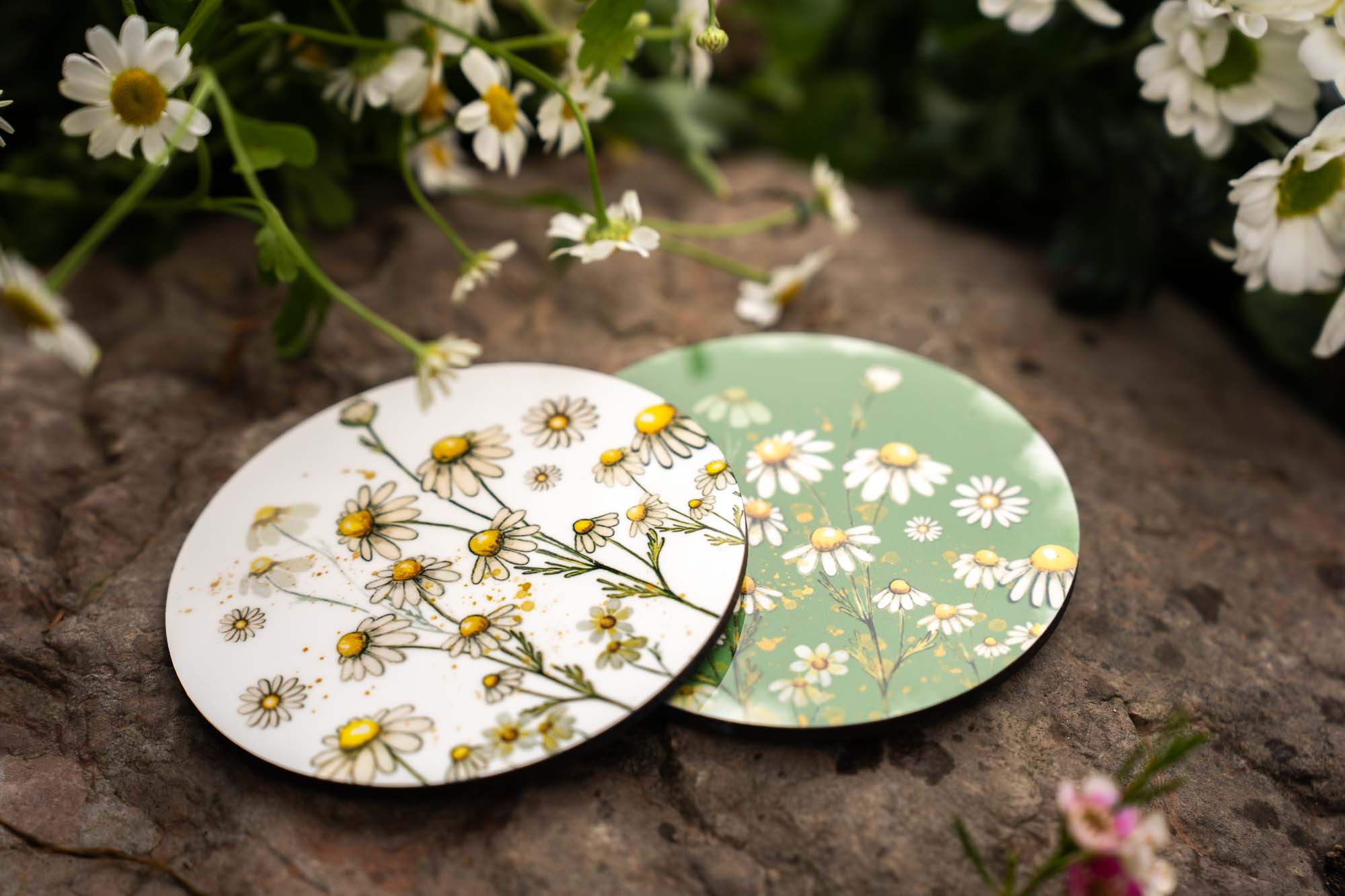 Symbolika heřmánku v tomto motivu dodává výrobku hlubší význam. Heřmánek je rostlinou, která od nepaměti symbolizuje klid, léčení, péči a rovnováhu. Připomíná, že v jednoduchosti se skrývá síla, a že i malé okamžiky – doušek čaje, vůně květin nebo chvíle ticha – mohou mít velký význam. Každý pohled na podtácek s heřmánky je jemnou připomínkou, že krása a harmonie mohou být všude kolem nás, pokud si je všimneme a dopřejeme si prostor pro jejich vnímání.