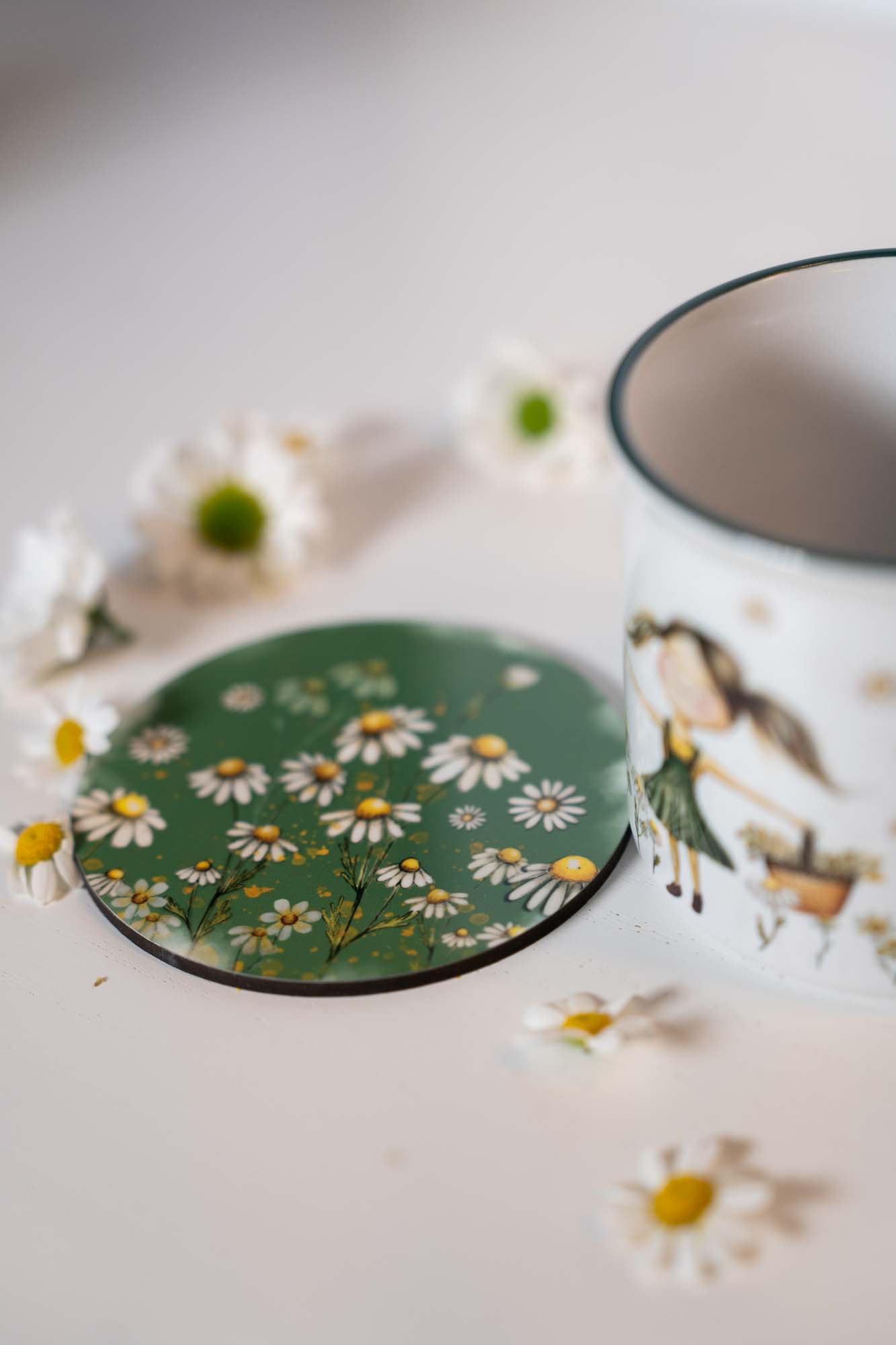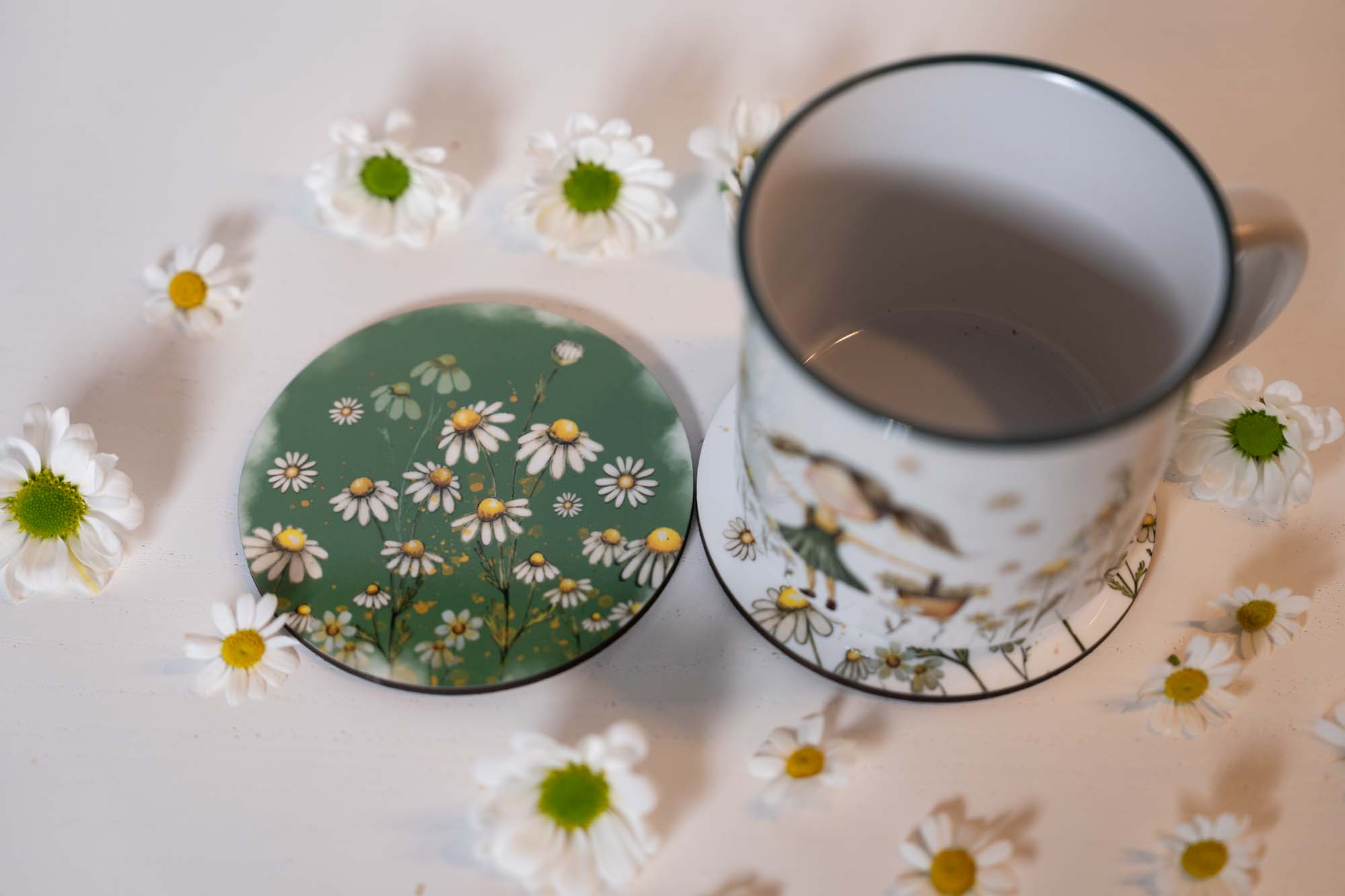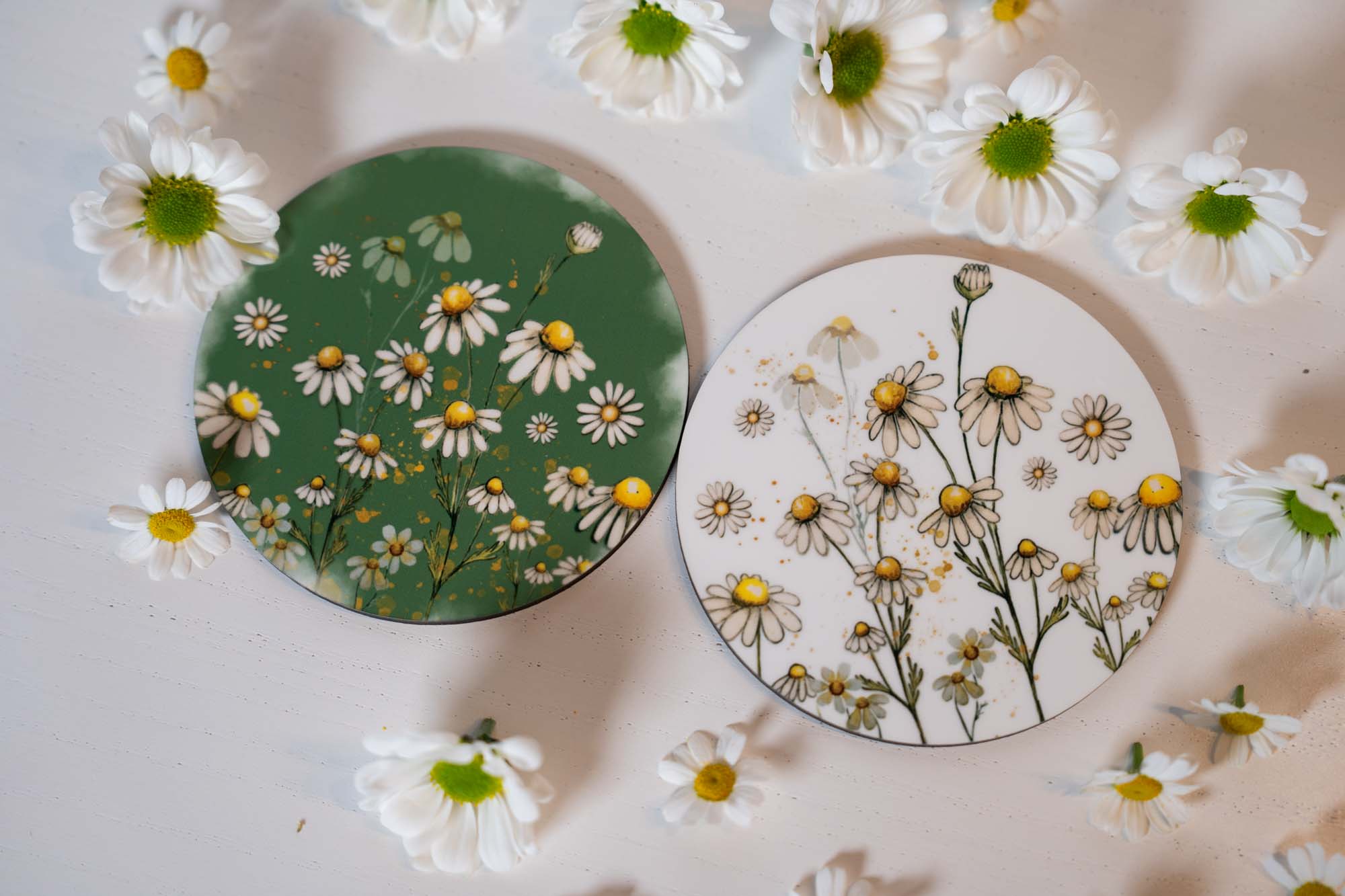 Skladem – výroba obratemKulatý podtácek pod hrnek s jemným motivem heřmánků přináší na váš stůl kousek letní louky a klidné pohody.