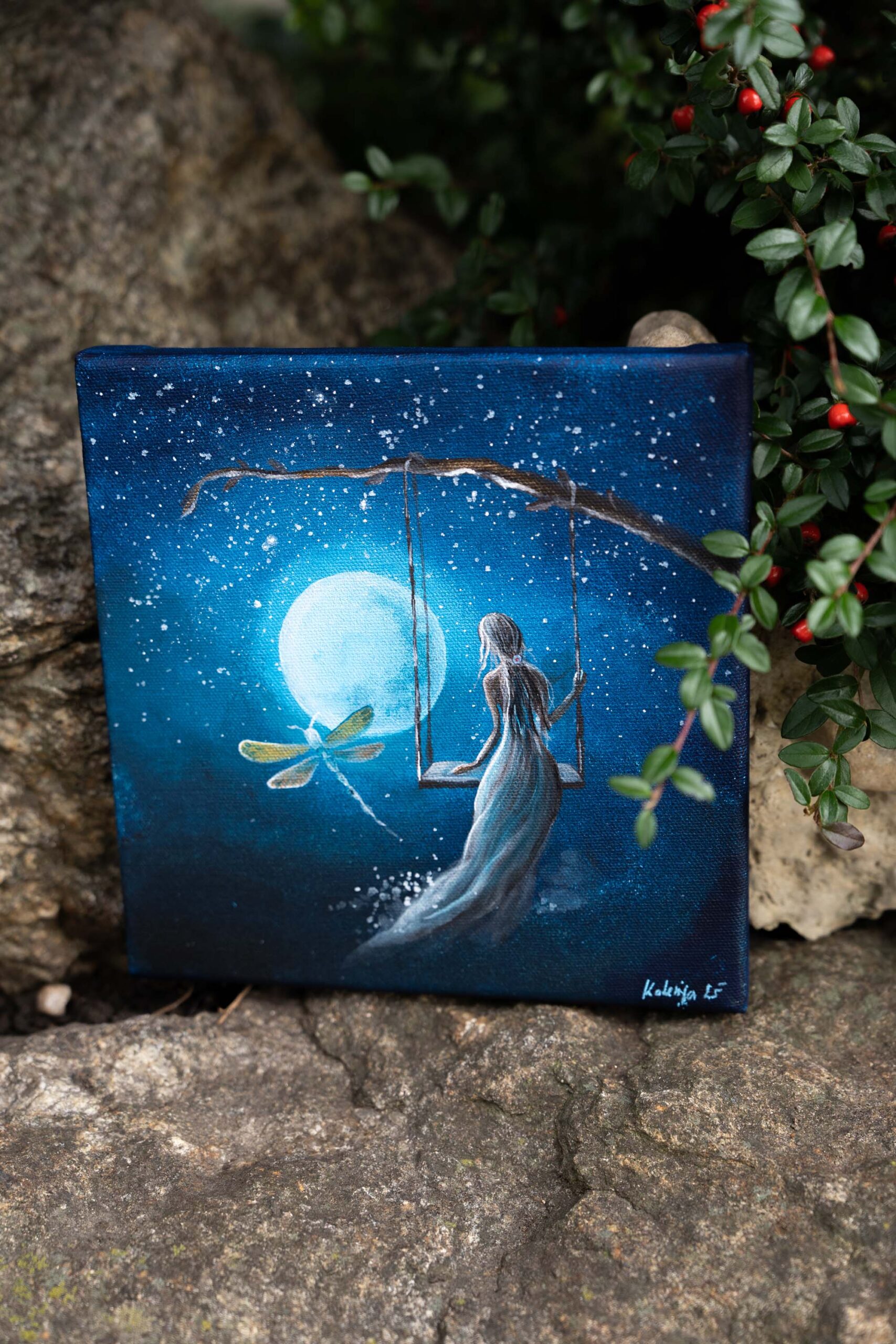 Obraz není jen dekorací, ale jemným poselstvím: důvěřuj svému nitru, naslouchej svým snům a dovol si být svobodná, i když kolem vládne ticho noci.