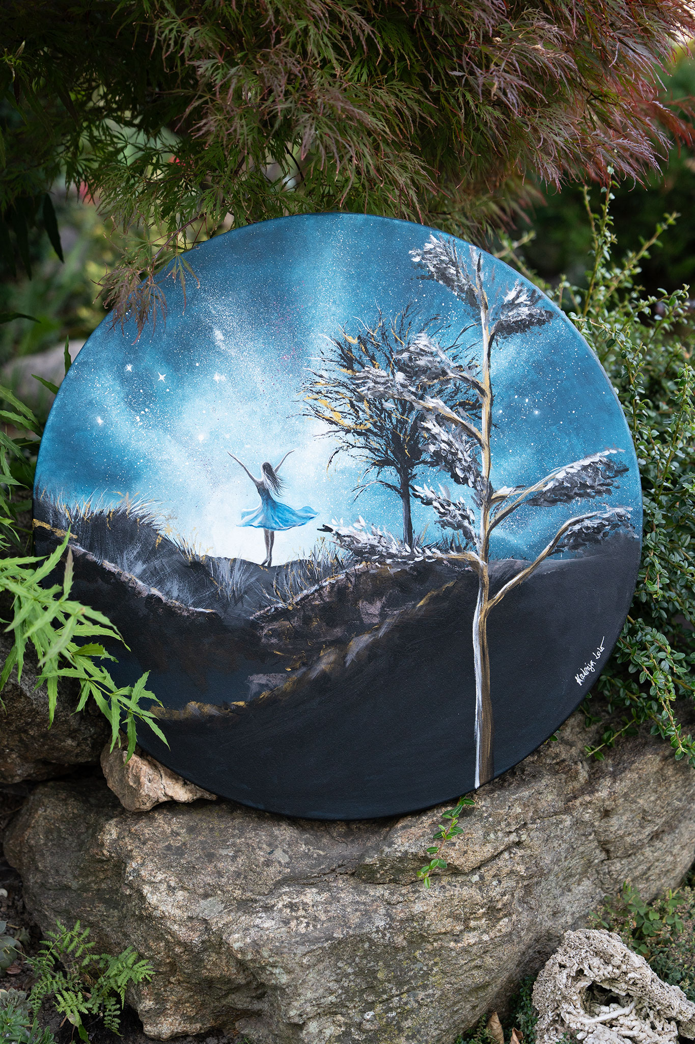 Malba akrylovými barvami na kulatém plátně o průměru 60cm.