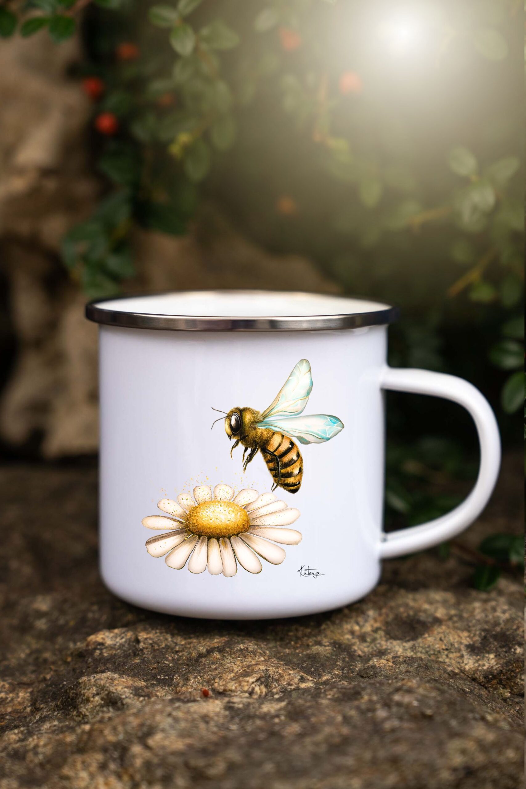 Tento jedinečný plecháček zdobí autorská malba včely, která je více než jen dekorativním motivem – nese v sobě silnou symboliku a poselství. Včela je od nepaměti chápána jako bytost propojující krásu přírody s neúnavnou pracovitostí. Připomíná nám harmonii mezi jednotlivcem a společenstvím, neboť sama je malá, avšak v celku dokáže vytvářet obrovské hodnoty.