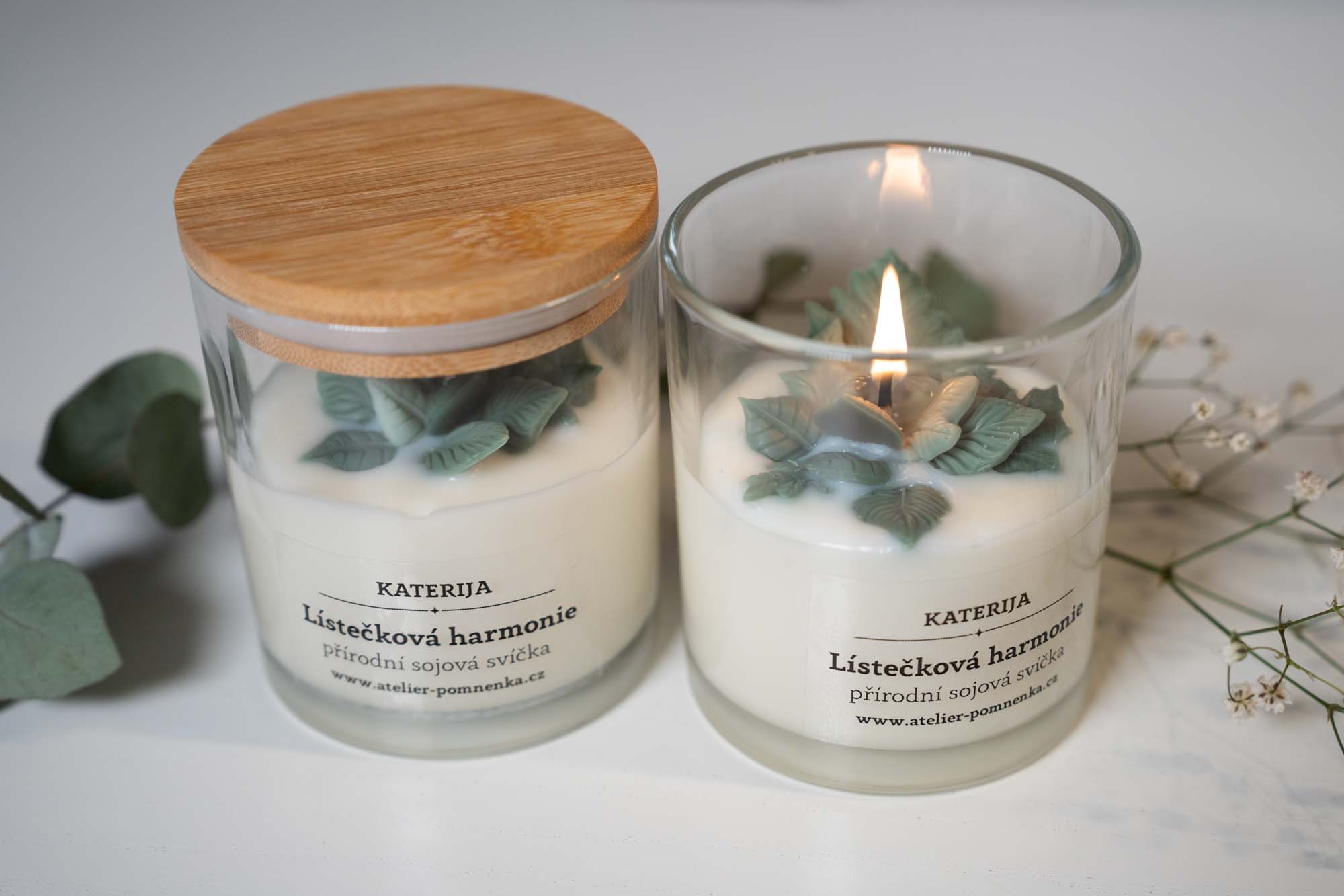 Celá svíčka je vyráběná ručně s péčí a důrazem na detail a krásu jemných okamžiků. Svíčka vyrobená milovnicí svíček a přírody. Kolekce „Lístečkovo“