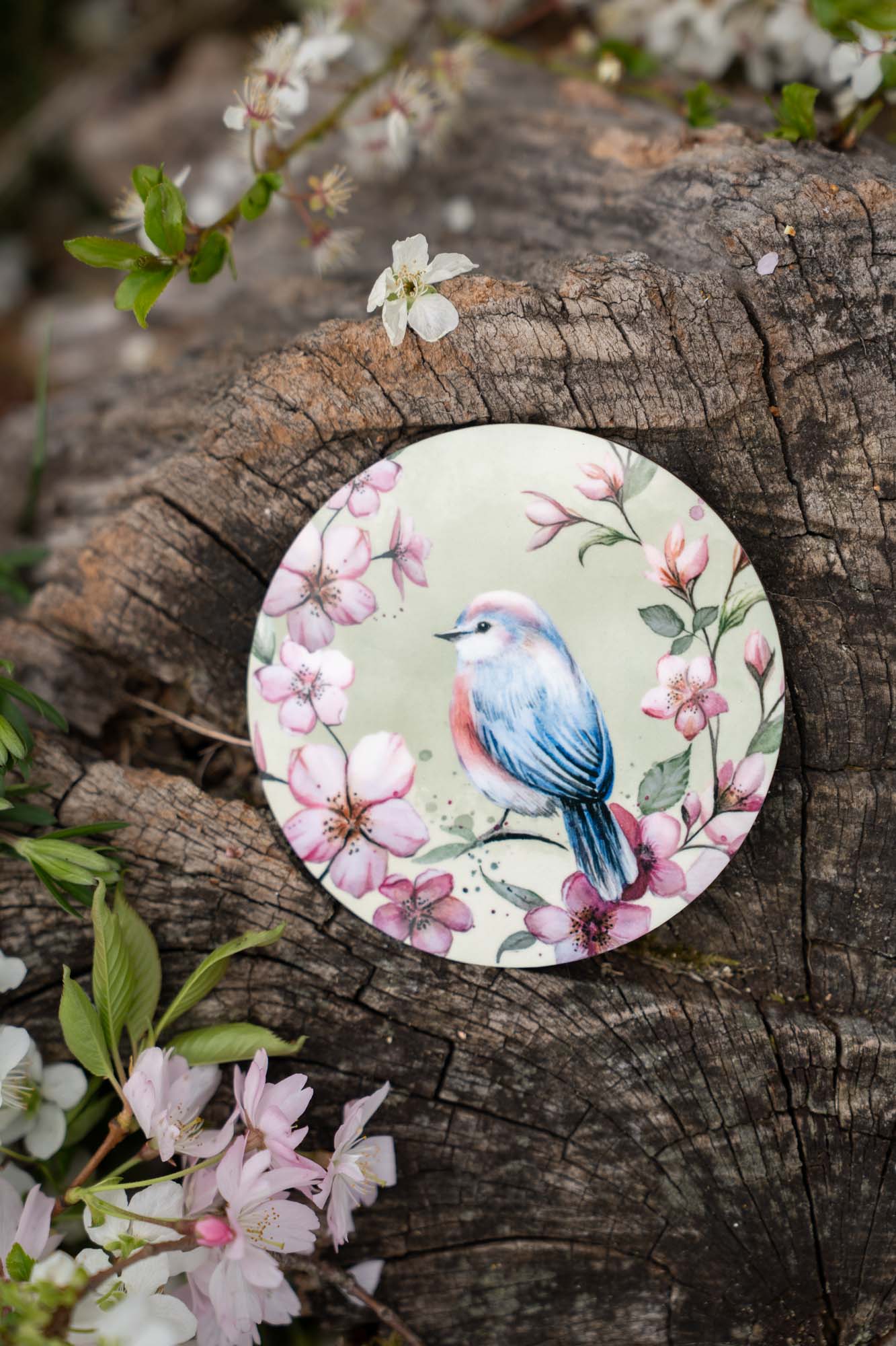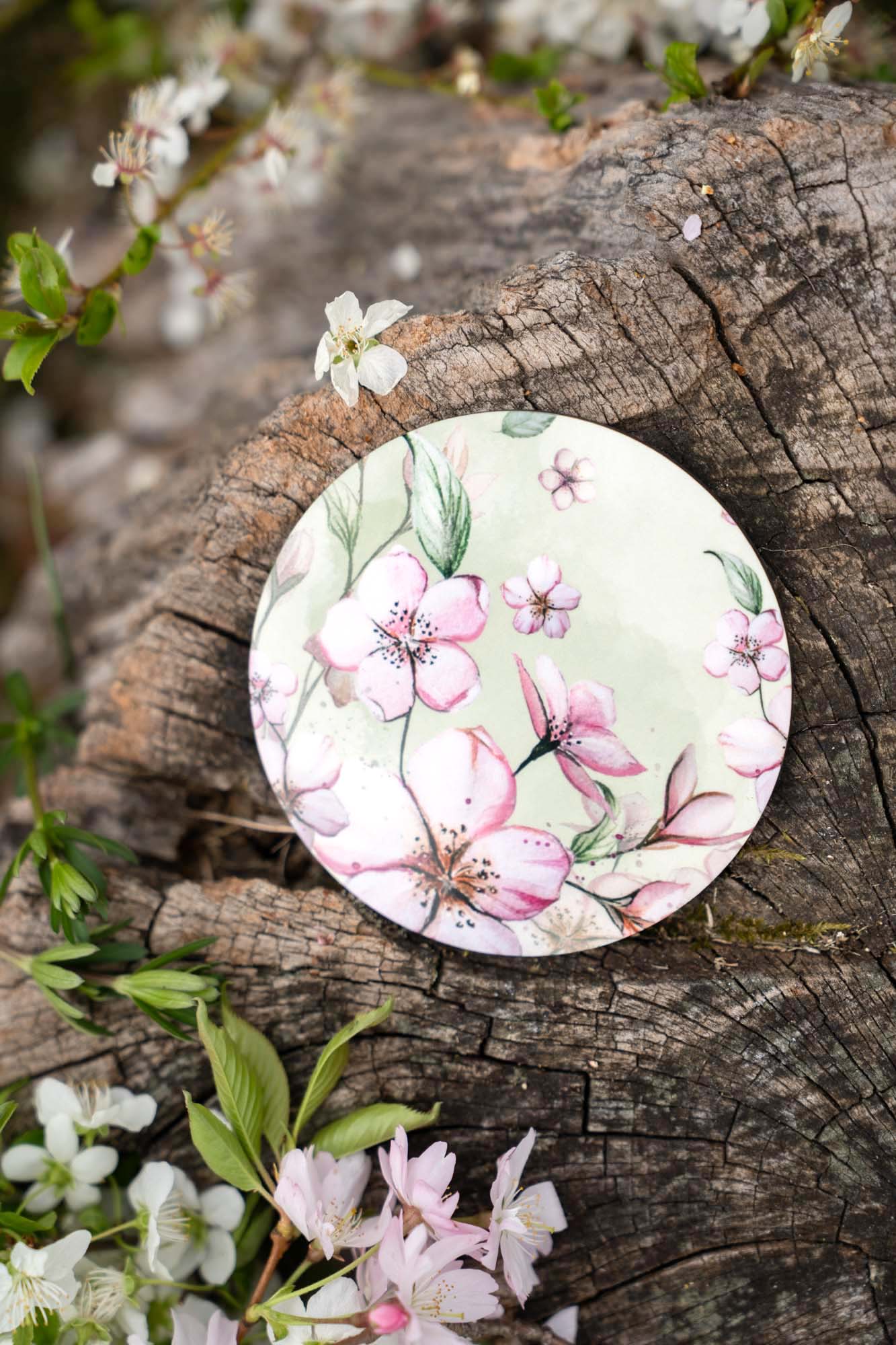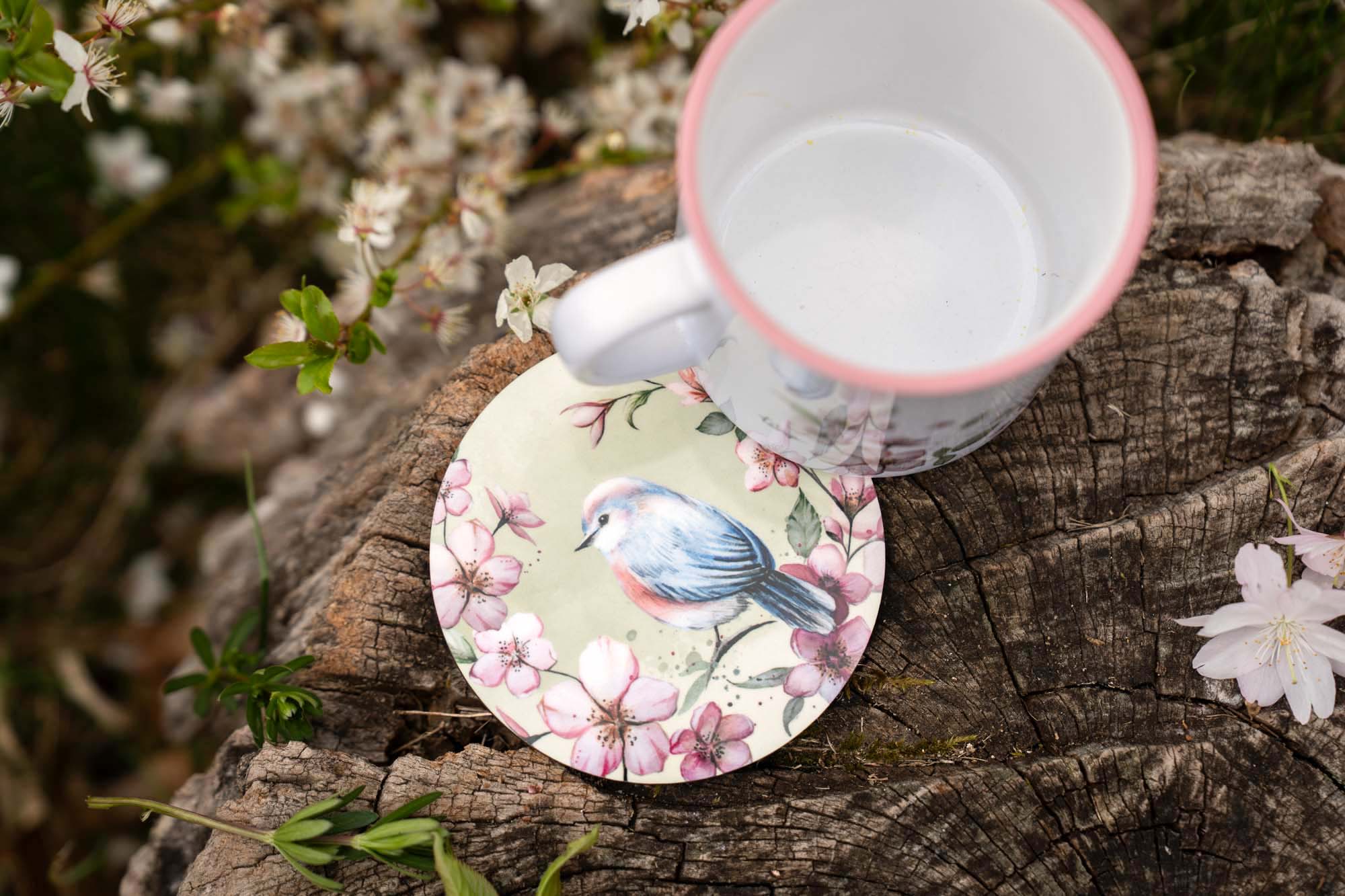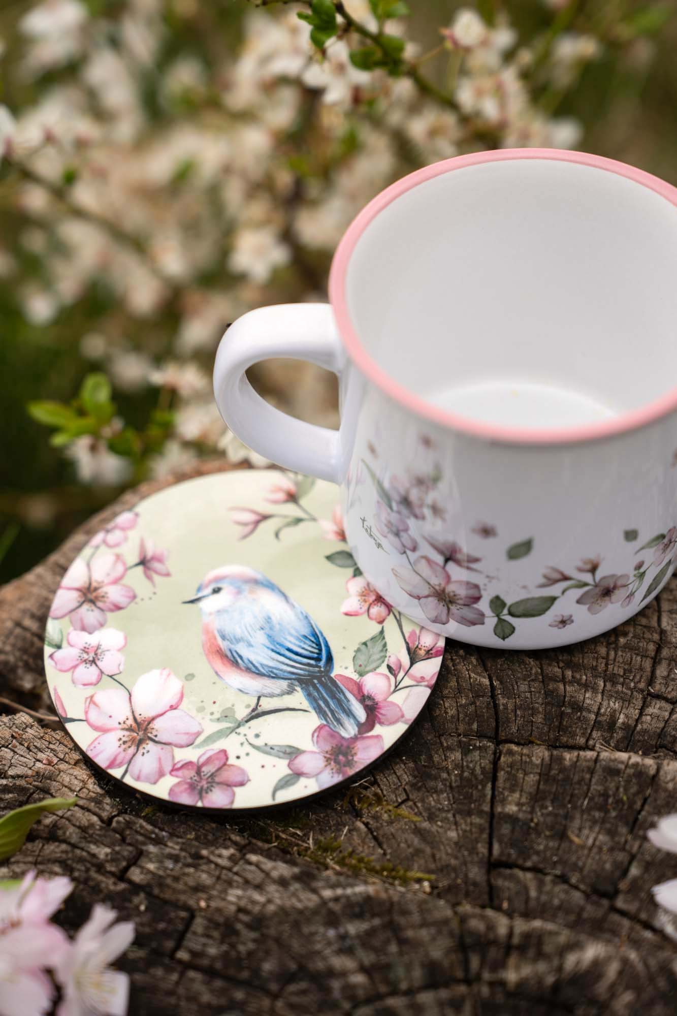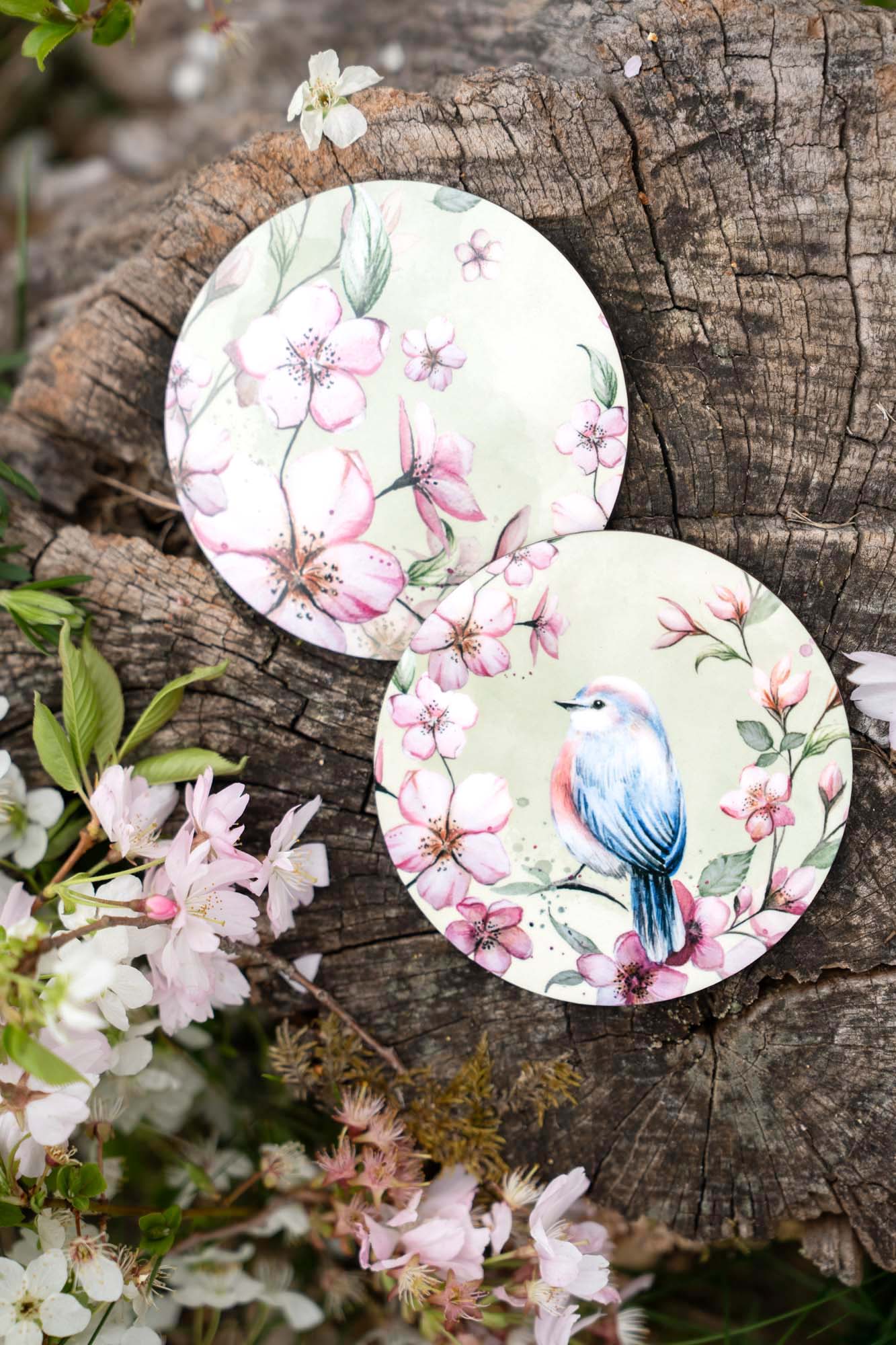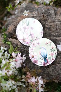 - První podtácek nese něžnou akvarelovou ilustraci rozkvetlých třešní doplněnou o malého ptáčka. Ten do kompozice vnáší život, lehkost a symboliku radosti z přítomného okamžiku. Působí klidně a tiše, jako strážce jarního sadu, který zve k zastavení a nadechnutí. Spolu s květy vytváří poetický motiv plný harmonie, jemnosti a přírodní rovnováhy.