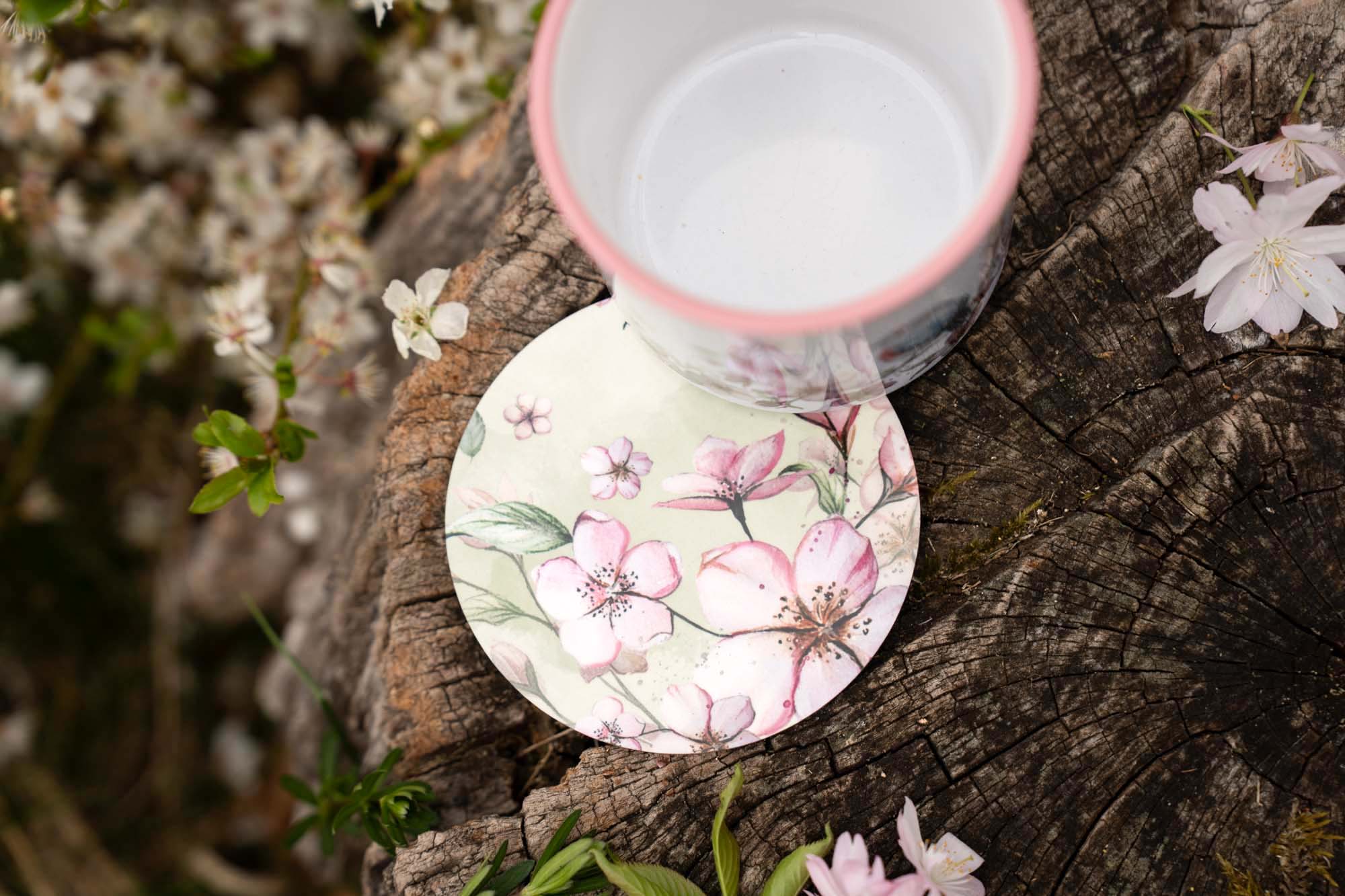 - Druhý podtácek je čistější a minimalističtější – tvořený pouze rozkvetlými třešňovými větvičkami. Jemné růžové květy působí vzdušně a elegantně, jako by se lehce vznášely v jarním vánku. Tento motiv zdůrazňuje samotnou krásu přírody a její tichou sílu v jednoduchosti.