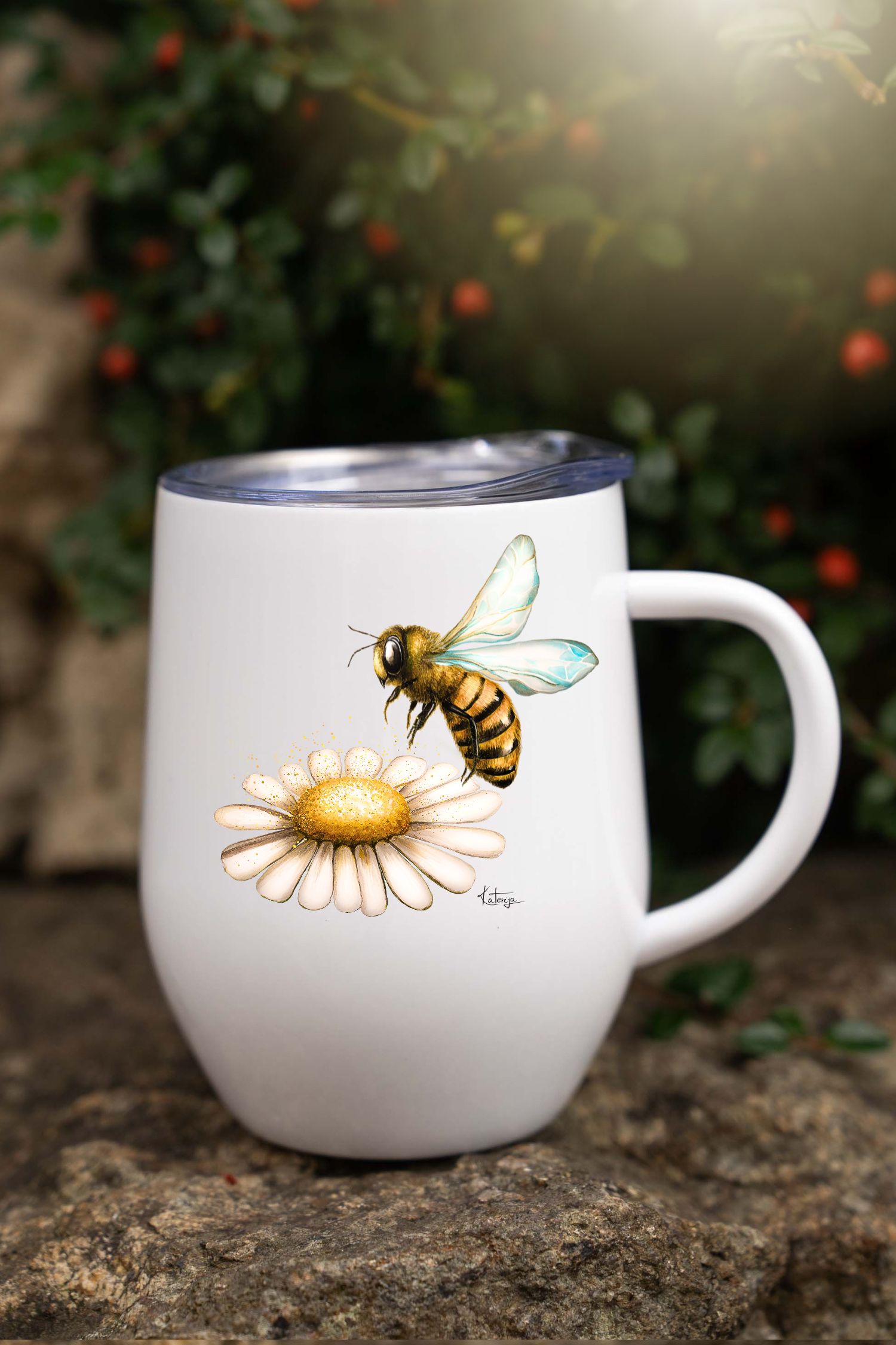 Termohrnek s uchem 360ml. Včela na této autorské malbě je poslem světla a života. Jemná a křehká, přesto silná a neúnavná, nese s sebou příběh o spolupráci, rovnováze a radosti z maličkostí. Jejím třepotem křídel se do prostoru rozlévá klidná energie přírody i připomínka, že krása spočívá v jednoduchosti a odvaze tvořit.