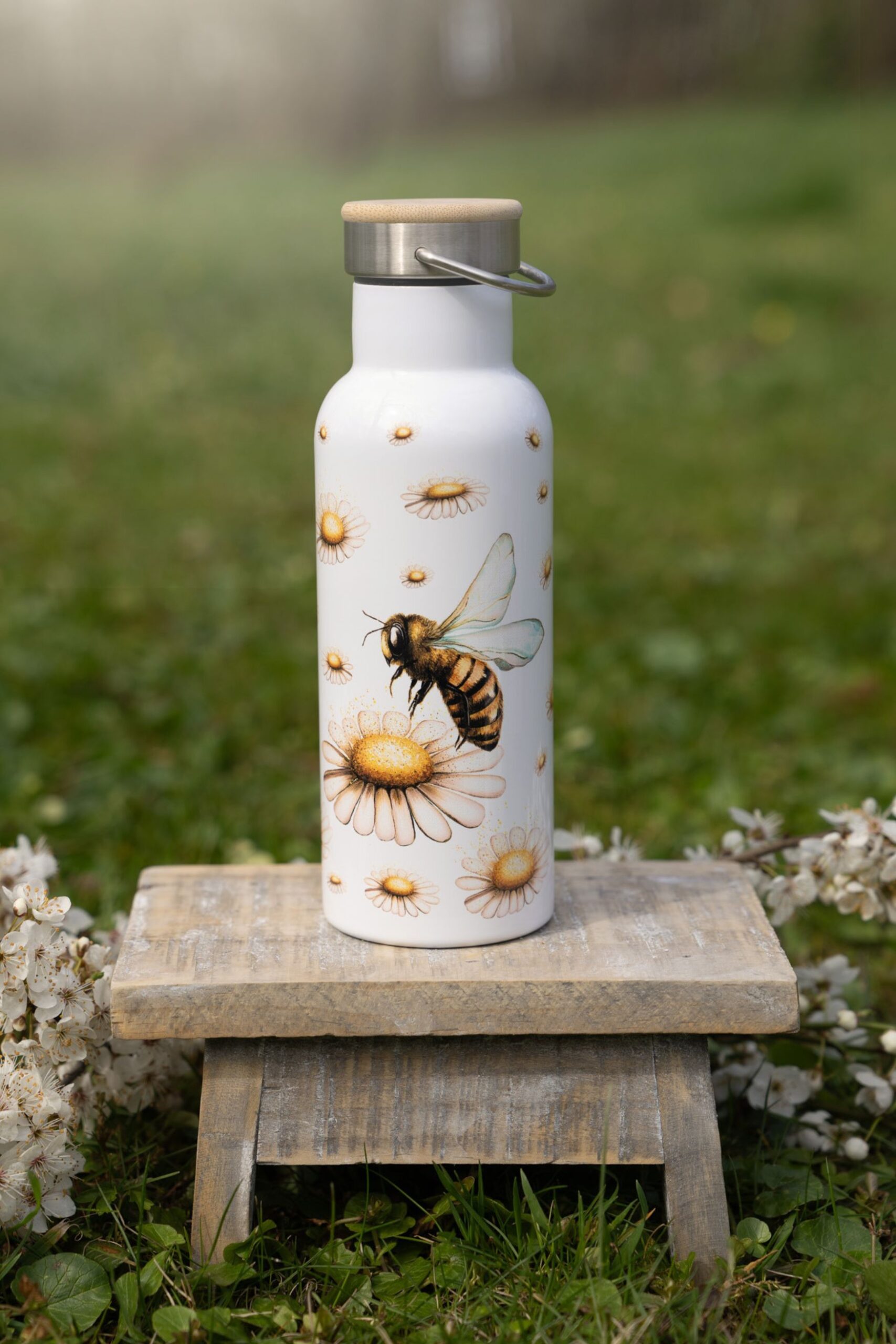 Termolahev 500ml. Včela na této autorské malbě je poslem světla a života. Jemná a křehká, přesto silná a neúnavná, nese s sebou příběh o spolupráci, rovnováze a radosti z maličkostí. Jejím třepotem křídel se do prostoru rozlévá klidná energie přírody i připomínka, že krása spočívá v jednoduchosti a odvaze tvořit.